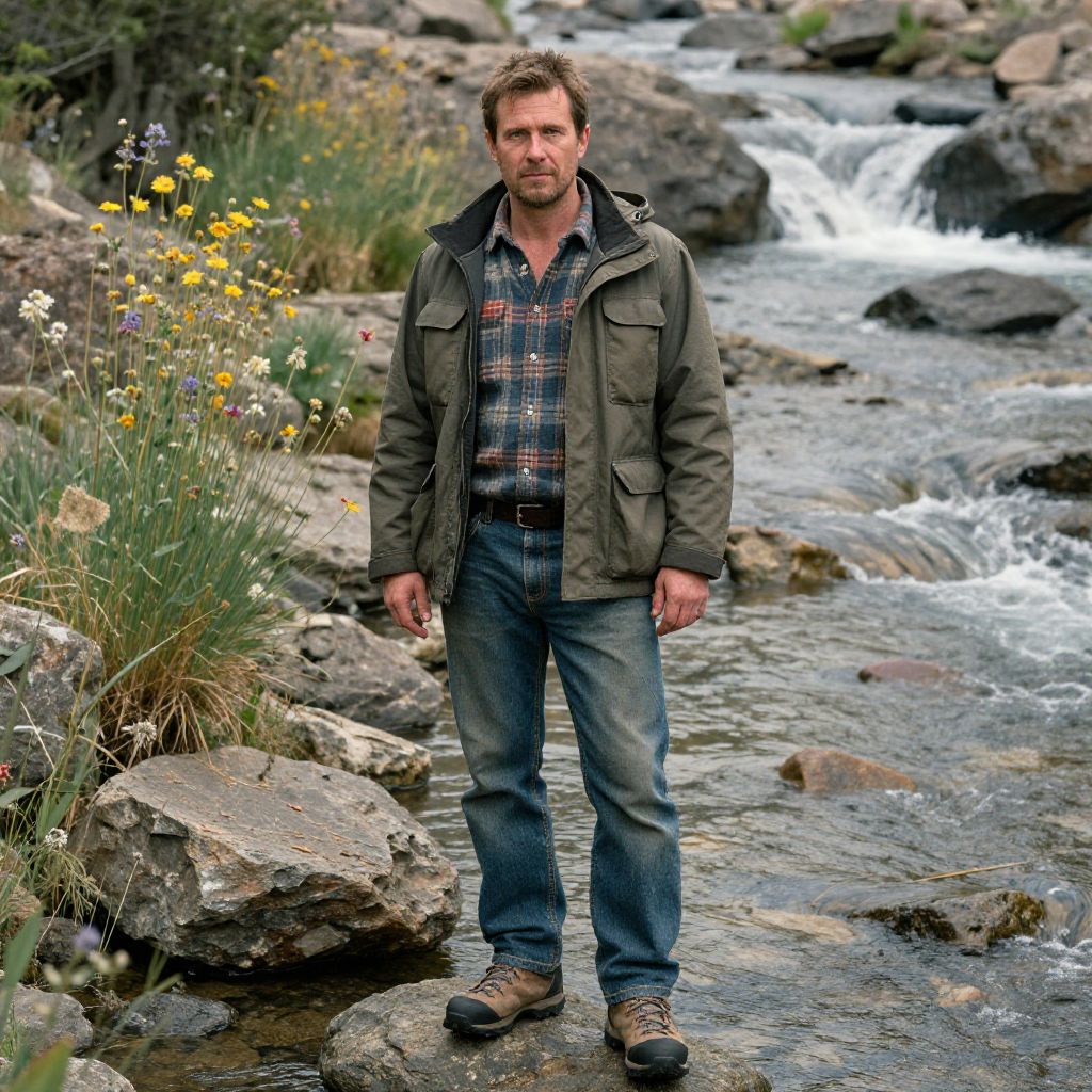 Photograph of a middle-aged white man standing in a rocky stream. He has short brown hair, a beard, and a serious expression. He wears a dark green jacket over a plaid shirt, blue jeans, and brown hiking boots. The background features a flowing stream with white water, surrounded by large rocks and yellow wildflowers. The scene is outdoors, with a natural, rugged landscape. The man stands on a smooth, wet rock in the center of the stream, with water partially covering his feet. The lighting is natural, highlighting the textures of the rocks and foliage.