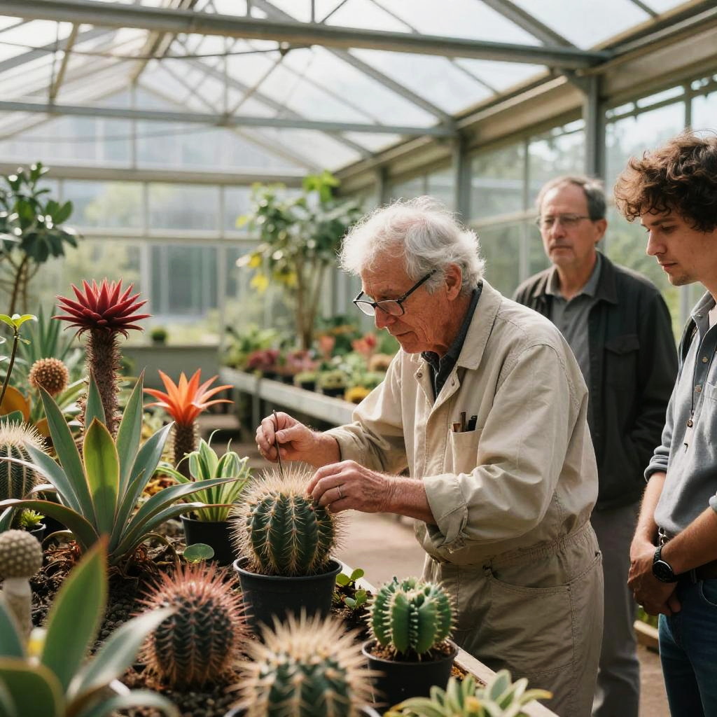In the heart of abandoned lunar colony greenhouse, a retired xenobotanist reveals lost techniques for cultivating alien flora to curious onlookers, as the sun casts a warm glow over the vibrant scene.