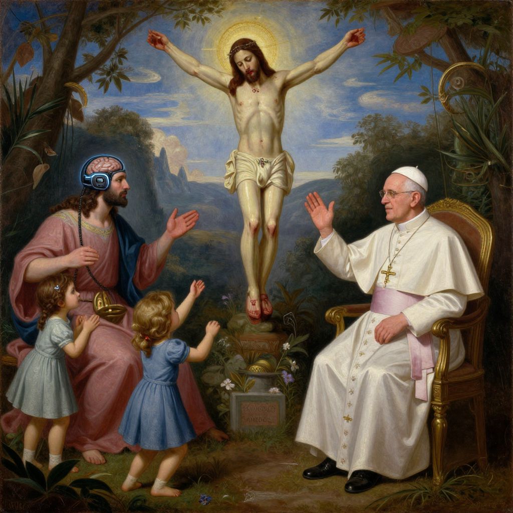 Brain-Computer Interface catholic, art, oil, painting, realistic, Jesus Christ, and Pope John Paul II IN THE GARDEN OF EDEN, YOUNG CHILDREN, SURROUND THEM AS THEY TELL STORIES,