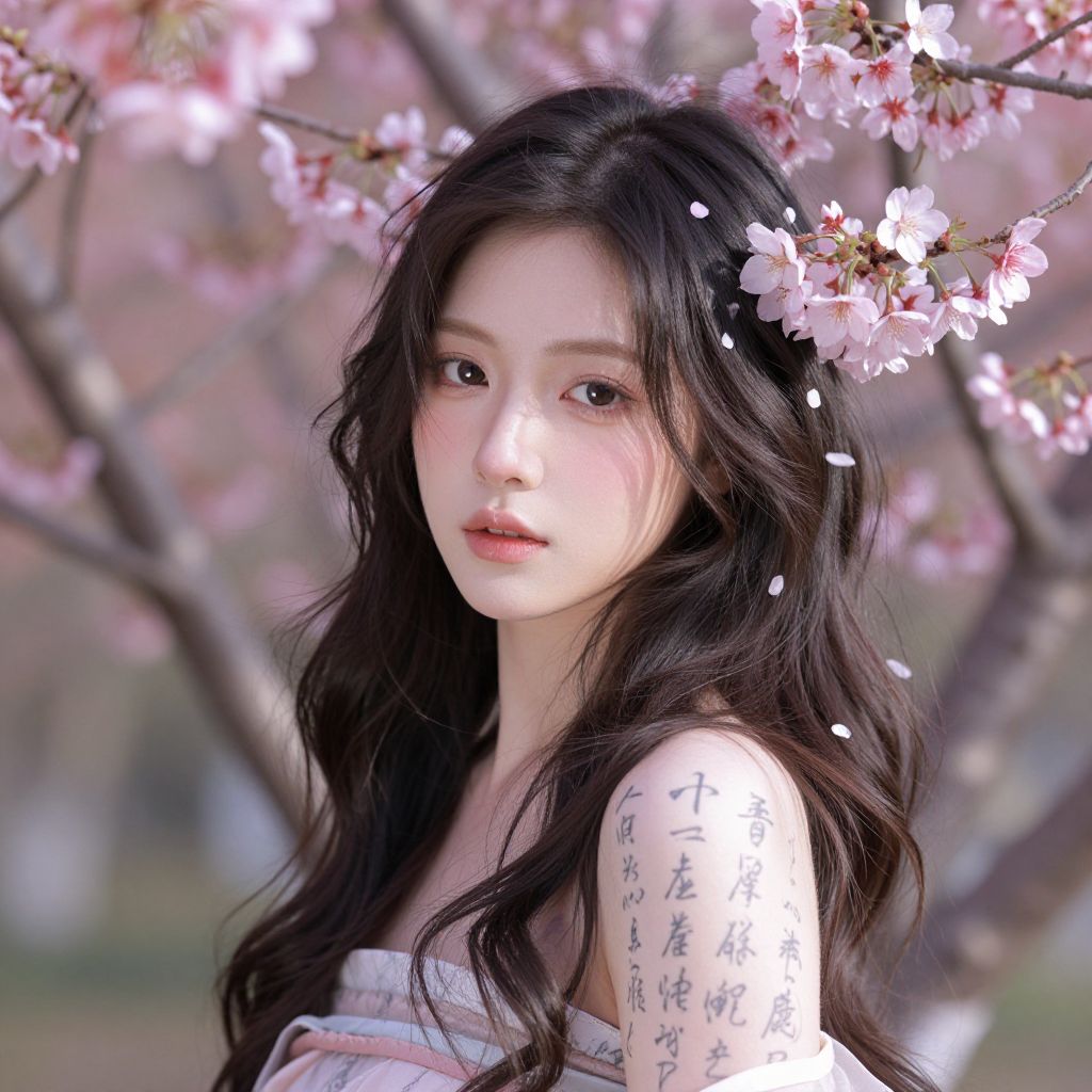 This digital artwork portrays a beautiful East Asian woman with long, wavy black hair adorned with pink cherry blossoms. Her pale skin contrasts with her dark hair, and she has large, expressive brown eyes. She wears a white, off-the-shoulder garment with delicate pink patterns. Her right arm, visible, displays intricate Japanese characters in black ink. The background is a soft-focus blur of pink cherry blossoms, enhancing the ethereal, springtime atmosphere. Light filters through the blossoms, casting a gentle glow on her face. The overall style is realistic with a slightly dreamy, almost romantic quality.