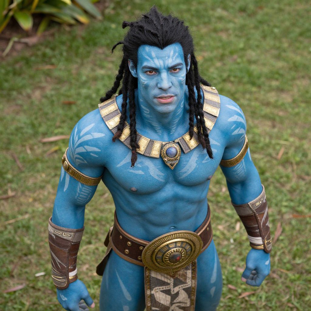 Overhead shot of a muscular man in a detailed Jake Sully cosplay from Avatar, featuring blue body paint with tribal white markings, a tribal loincloth, chest and shoulder accents, and dreadlocked black hair. The costume includes golden arm bands, a large decorative belt, and wrist guards. The background is green grass and some foliage.