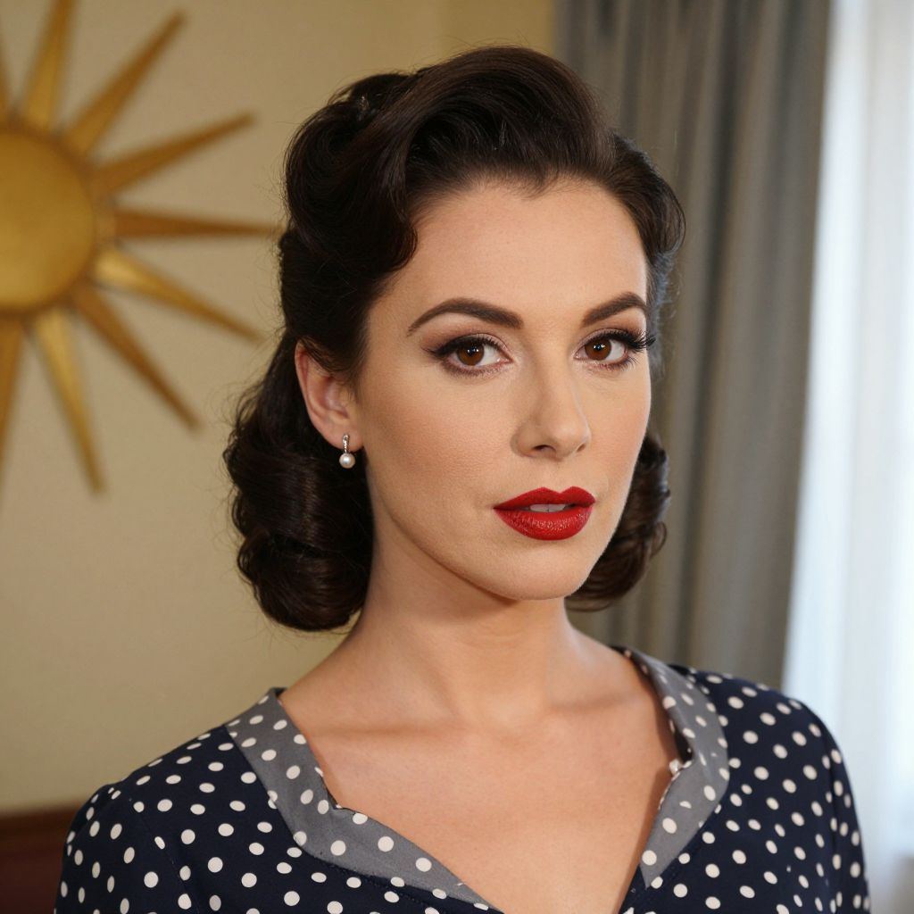 Photograph of a fair-skinned woman with dark, wavy hair styled in a vintage 1940s updo. She has dark, arched eyebrows, bold red lipstick, and subtle eyeshadow. She wears a black halter dress with white polka dots and small, silver hoop earrings. A gold sunburst wall decoration and blue curtains are visible in the background. The woman's expression is calm and poised, exuding a classic, glamorous style. The lighting is soft, highlighting her facial features and the texture of her dress.