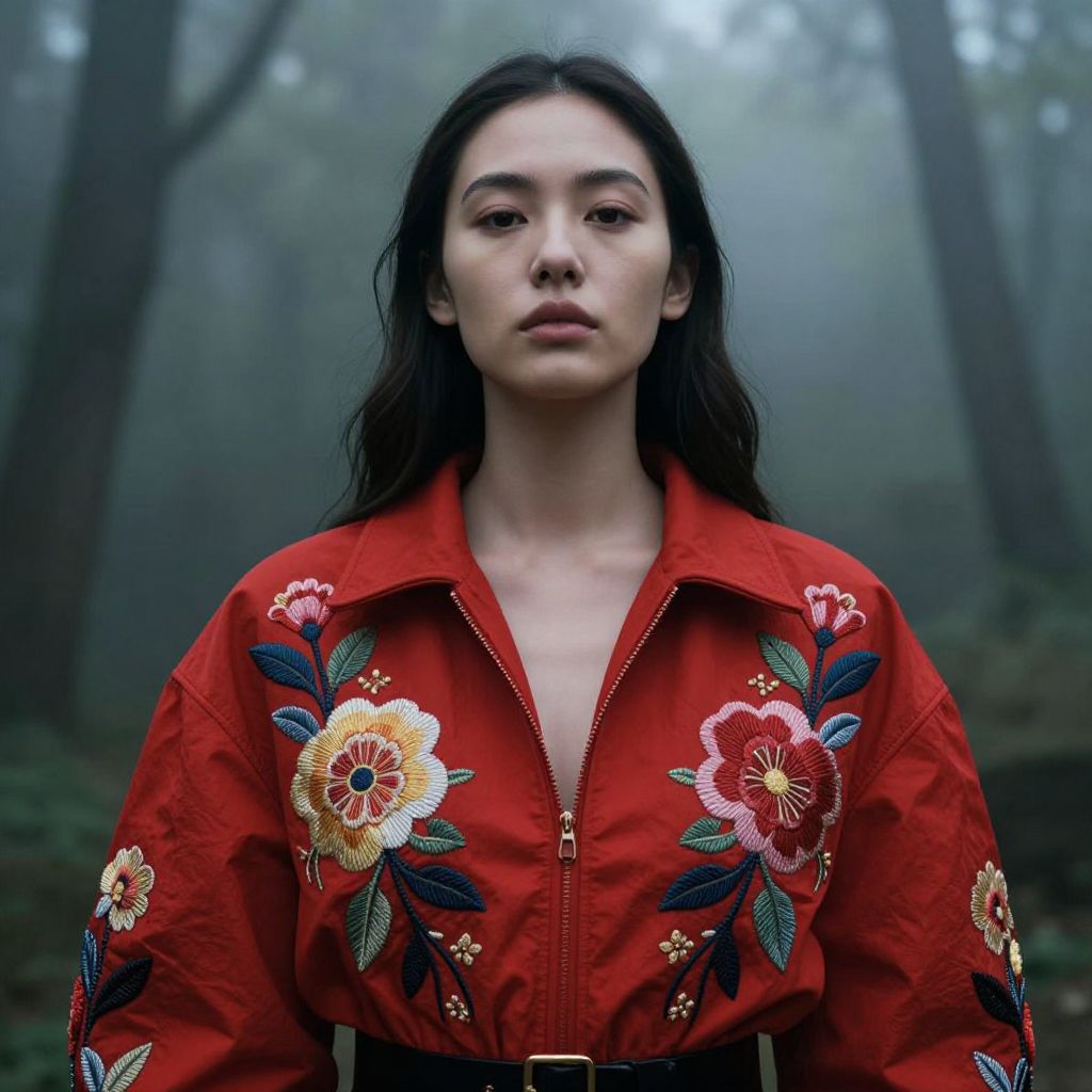 Photograph of an Asian woman with long black hair, wearing a red jacket adorned with colorful floral embroidery, standing in a misty forest.