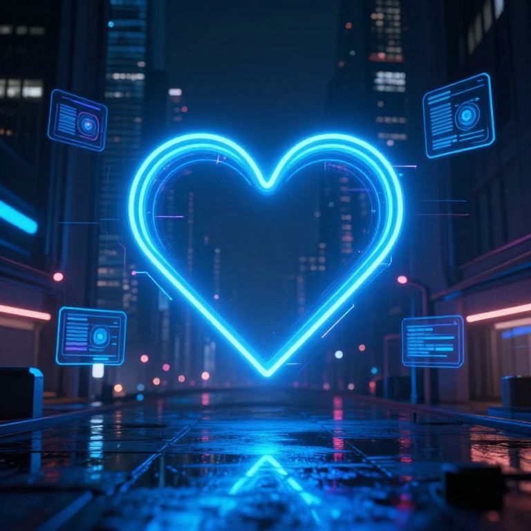 Neon blue heart glowing vibrantly in a dark cyberpunk cityscape, surrounded by futuristic holograms and reflections on wet pavement, atmospheric and moody lighting