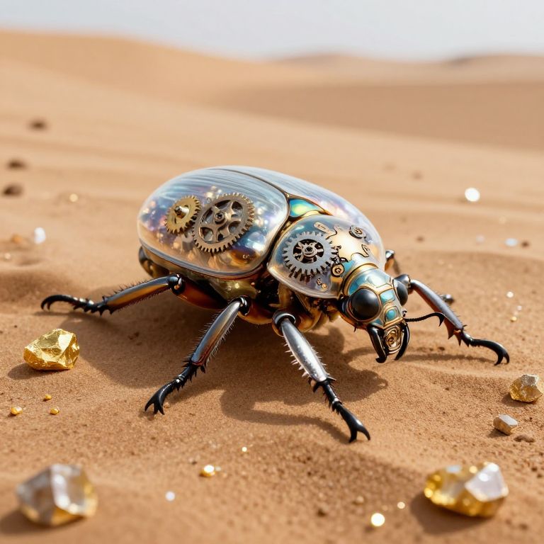 A colossal desert beetle adorned with intricate mechanical gears and a luminous, translucent shell crawls across a dune scattered with golden fragments and crystalline shards, defying the ordinary boundaries of nature and engineering.