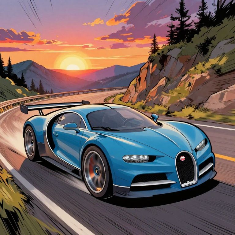 Bugatti cartoon speed racer driving on a winding mountain road, exaggerated aerodynamic design, bold comic book outlines, dramatic perspective with motion lines, colorful sunset sky in the background, energetic and adventurous vibe, detailed wheels spinning intensely.