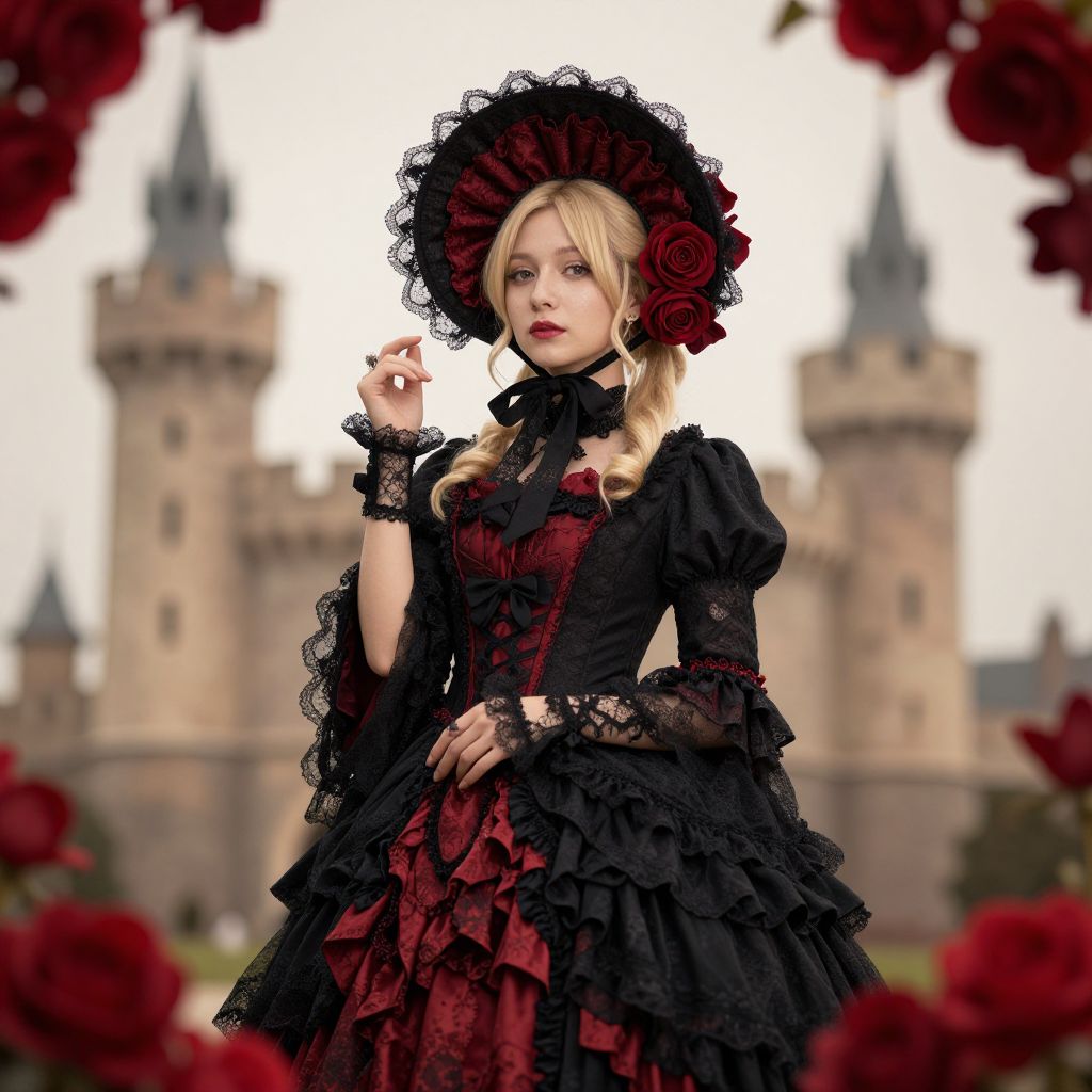 Portrait of a young blonde woman dressed in a Victorian-style black and red lace gown with matching accessories. She wears a wide-brimmed hat decorated with red roses and black lace. The background features blurred castle towers and red roses framing the composition, emphasizing a vintage, romantic atmosphere.