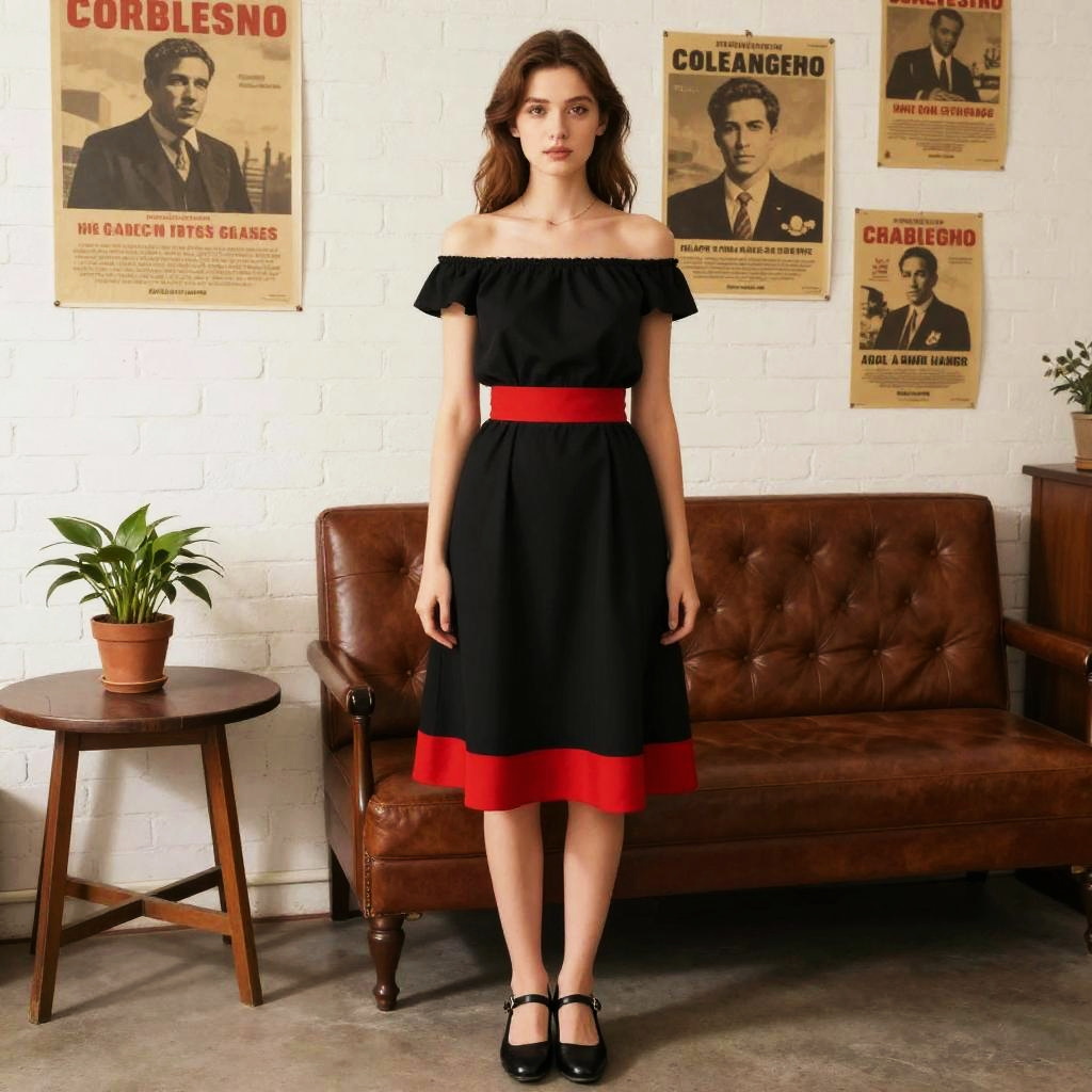 Photograph of a young woman with fair skin and wavy brown hair standing in a vintage-style room. She wears an off-shoulder black dress with a red belt and red hem, black shoes, and minimal makeup. The background features a white brick wall adorned with three vintage-style posters of Corleone, Collangeo, and Braziliano. A brown leather couch and a small round wooden side table with a potted plant are positioned to her right. The room has a rustic, mid-20th-century aesthetic with muted colors and simple decor.