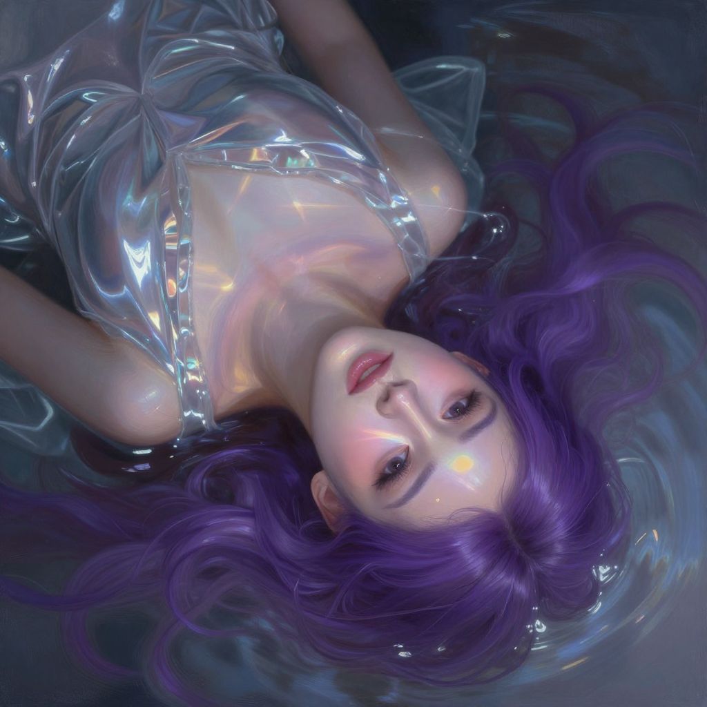 Envision a surreal digital painting depicting a close-up portrait of a woman with vivid purple hair, draped in a glistening metallic gown that flows like liquid. The perspective is uniquely angled, viewing her face from above as if she were submerged within a reflective pool, creating an intriguing visual gradient between the distorted surroundings and her enigmatic expression. Soft, ethereal lighting illuminates her visage, with luminous rays piercing through the water's surface to cast a mesmerizing prismatic glow across her features, enveloping both subject and viewer in a world of enchantment and mystery.