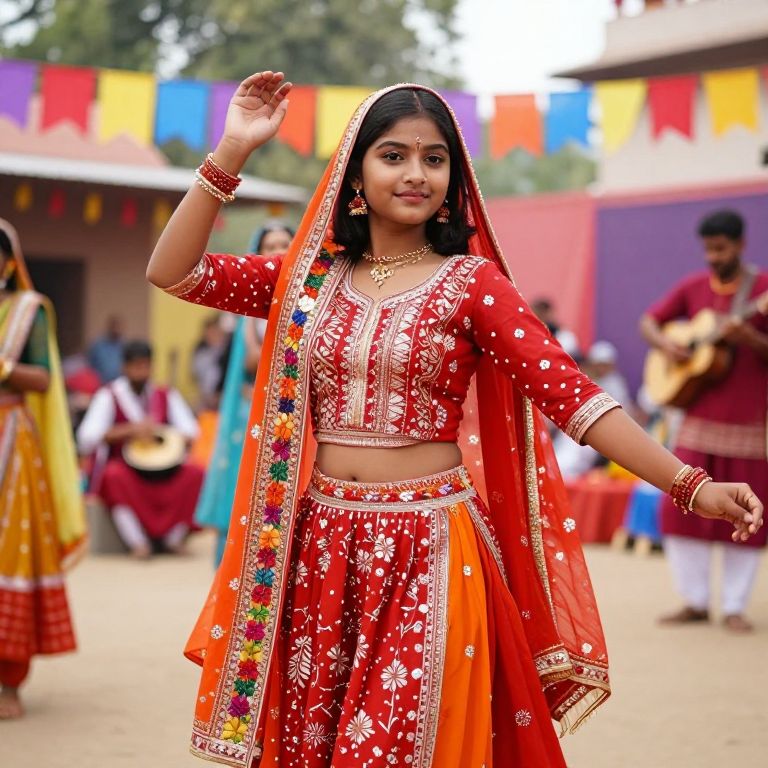 A vibrant outdoor scene of a teenage girl with oval face, medium brown skin, and bright eyes, wearing a beautifully designed Sambalpuri salwar suit with a floral border and red-orange tones, dancing in a traditional village wedding setting in Bihar with colorful flags and local folk music playing in the background.