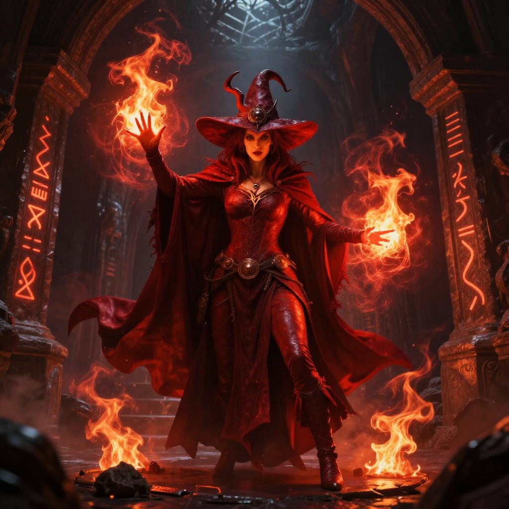 Digital artwork of a dark, winged demoness casting glowing purple magic spells over a fiery, circular rune in a mystical forest.