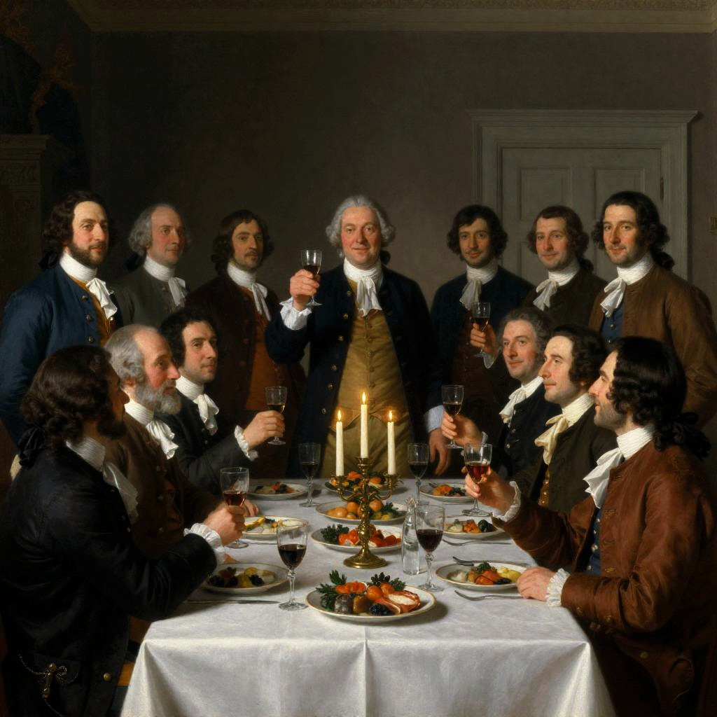 Historical painting of a formal dining room scene. Group of 15 men in 18th-century attire, some standing, some seated. Central figure raises a glass, others clink glasses. Table with candles, food, and wine. Background includes a fireplace and door. Men have varied expressions, mostly neutral to smiling. One man with gray beard, others with dark hair, some bald. Warm, dim lighting.