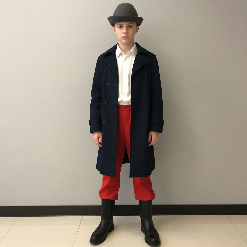 Timmy time costume, 1boy, solo, male focus, hat, boots, red pants, pants, full body, standing, black footwear, jacket, looking at viewer, indoors, coat