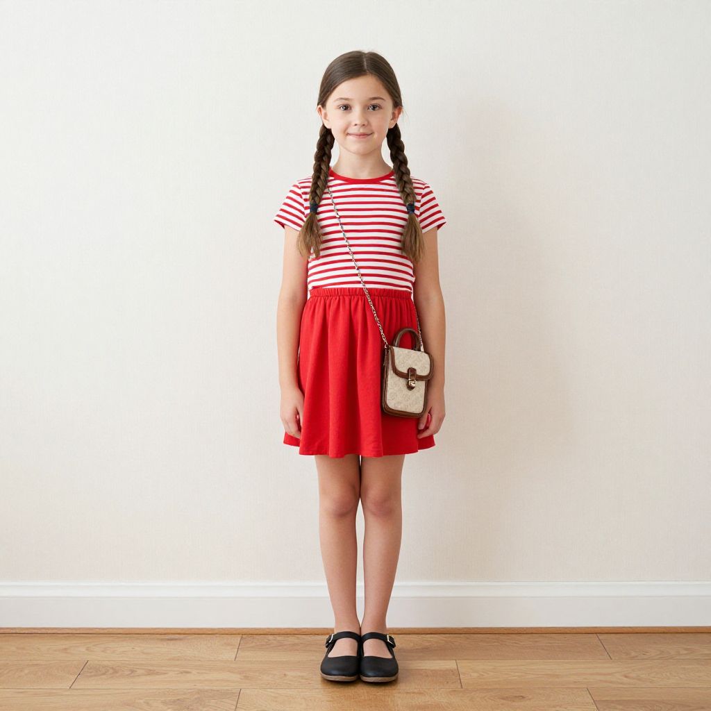 Photograph of a young Caucasian girl standing against a plain white wall with light wooden flooring. She has long brown hair in two braids, fair skin, and is smiling gently. She wears a red and white striped, short-sleeve, fitted shirt with a red, knee-length, A-line skirt. She has black Mary Jane shoes and carries a small, beige, cross-body purse with a gold chain strap. The background is minimal, emphasizing the girl's outfit and simple, clean look. The image is brightly lit, highlighting the girl's cheerful expression and colorful attire.