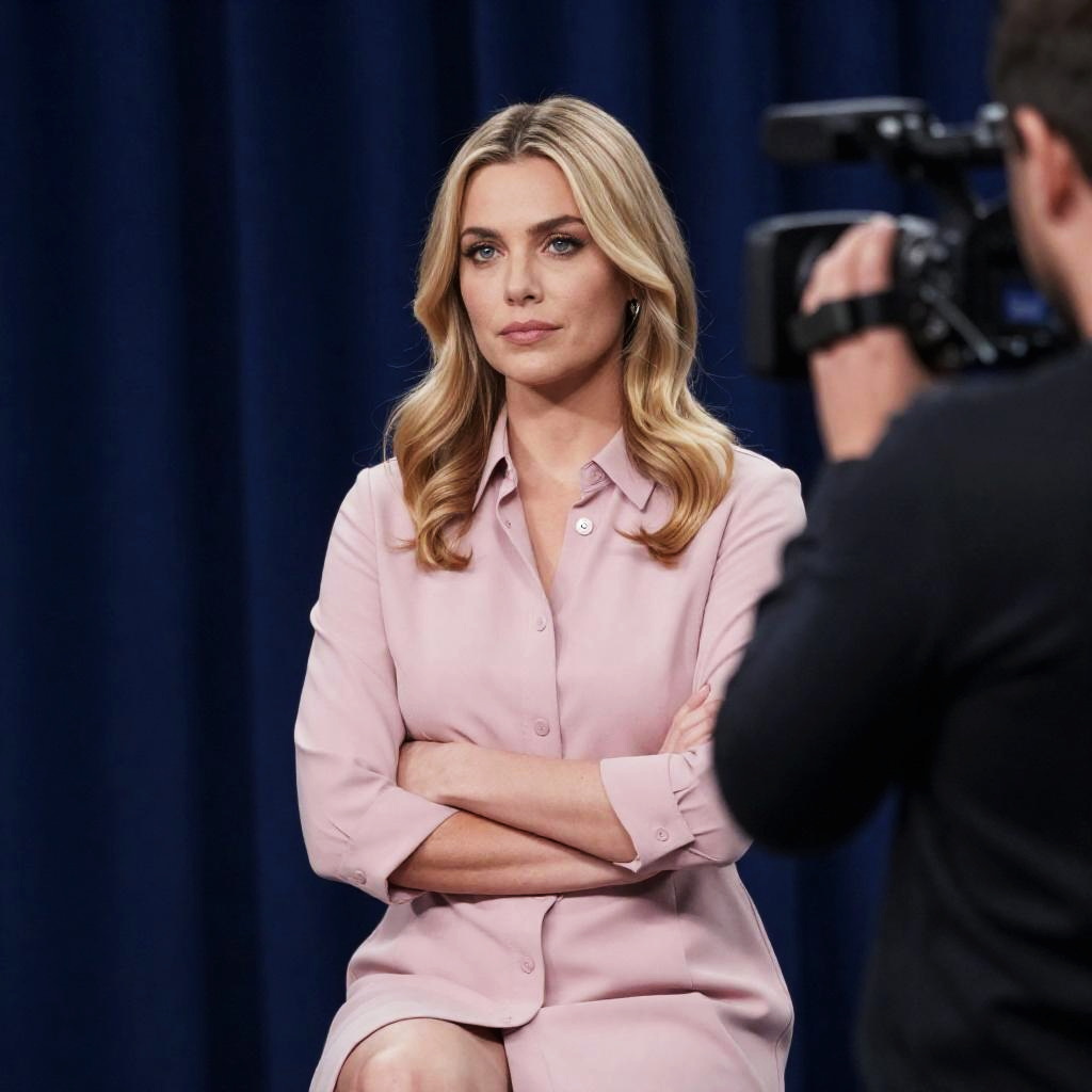 Photograph of a blonde woman with voluminous hair, wearing a purple blazer, black top, and necklace, holding a pink mug and microphone. Behind her, a blurred image of three men: one waving, one holding bread, one with a microphone. Top of image has a red clock displaying "00:00". Woman smiles, men have intense expressions. Blue carpet background.