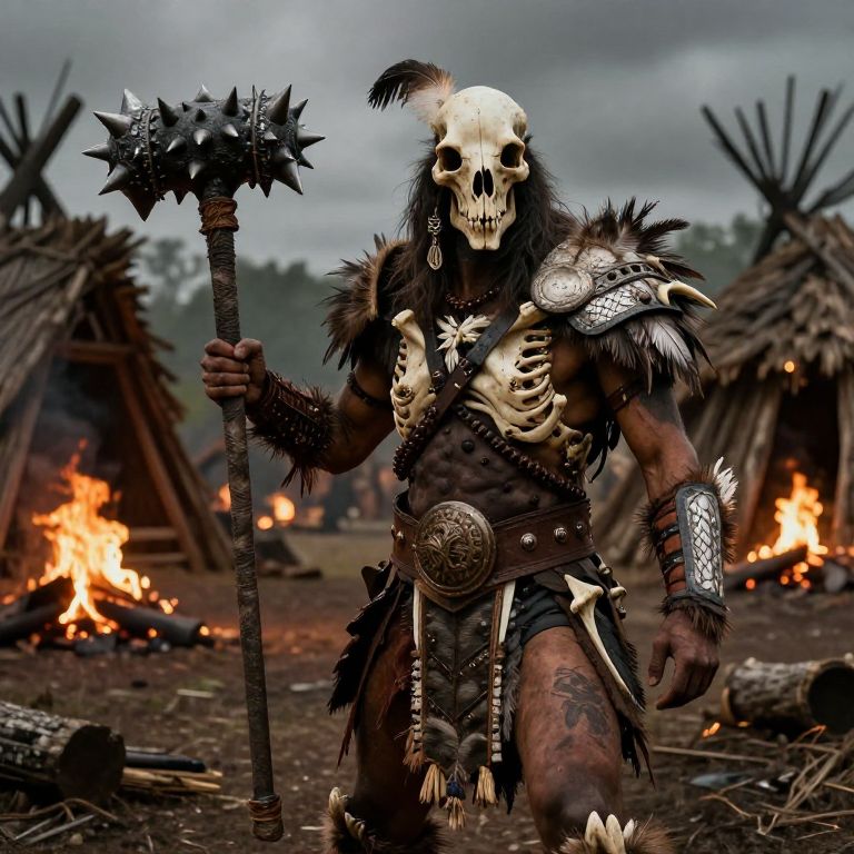 Ghog warrior in tribal armor made from bones and feathers, holding a large spiked club, set against a backdrop of tribal village fires and wooden huts, detailed textures with a dark, gritty fantasy atmosphere and muted color palette.