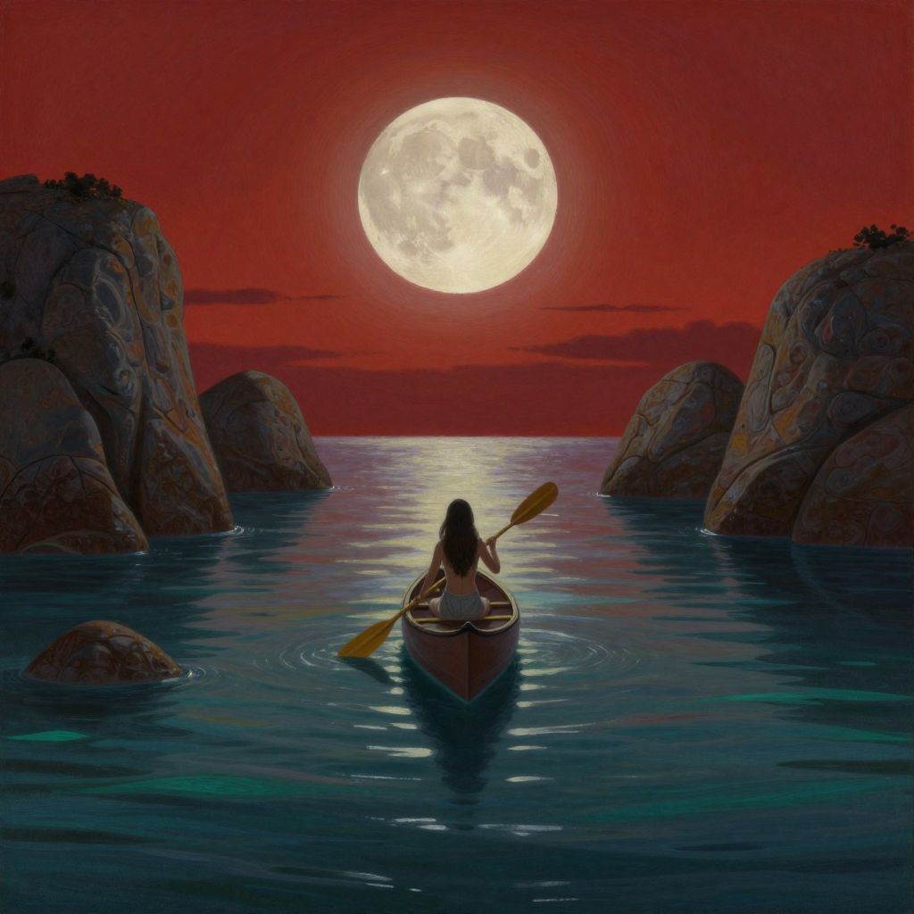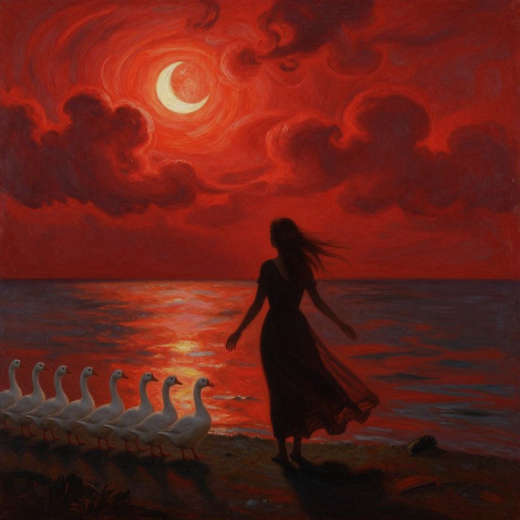 Silhouetted woman with flowing dress stands on red-tinted shore, facing eerie red crescent moon and swirling clouds in dramatic digital painting.