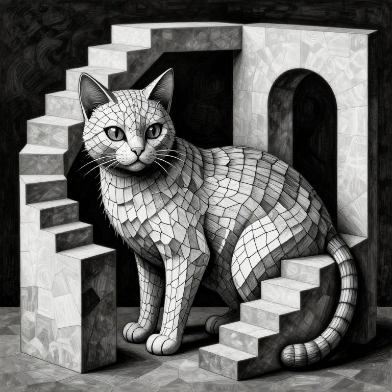 MC Escher cat intricately designed in impossible geometry style, with tessellated fur patterns morphing into staircases and intertwining shapes, monochrome palette emphasizing surreal optical illusions in a mysterious dream-like setting.