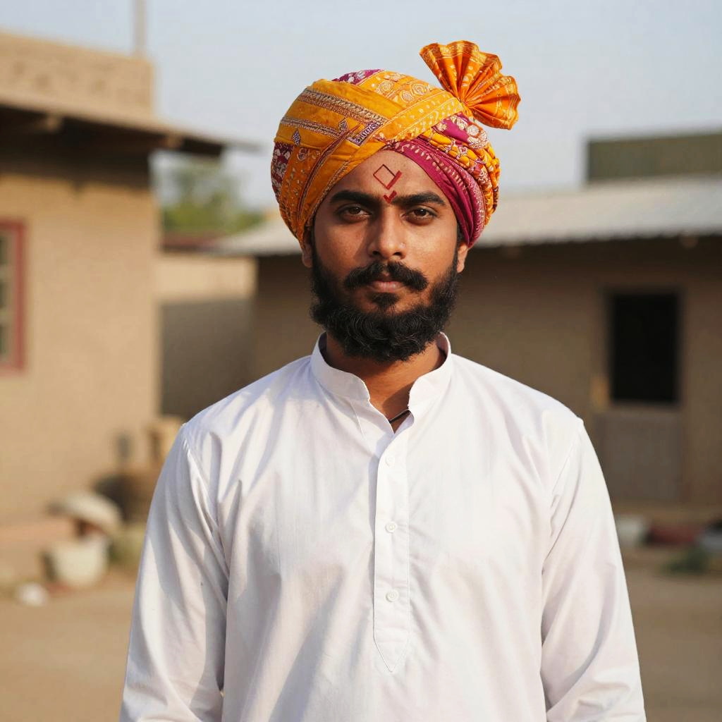 Indian male with a defined V shape beard, wearing a colorful turban and kurta, standing against a rustic village backdrop, soft sunlight casting gentle shadows, emphasizing the beard's geometric precision and cultural richness