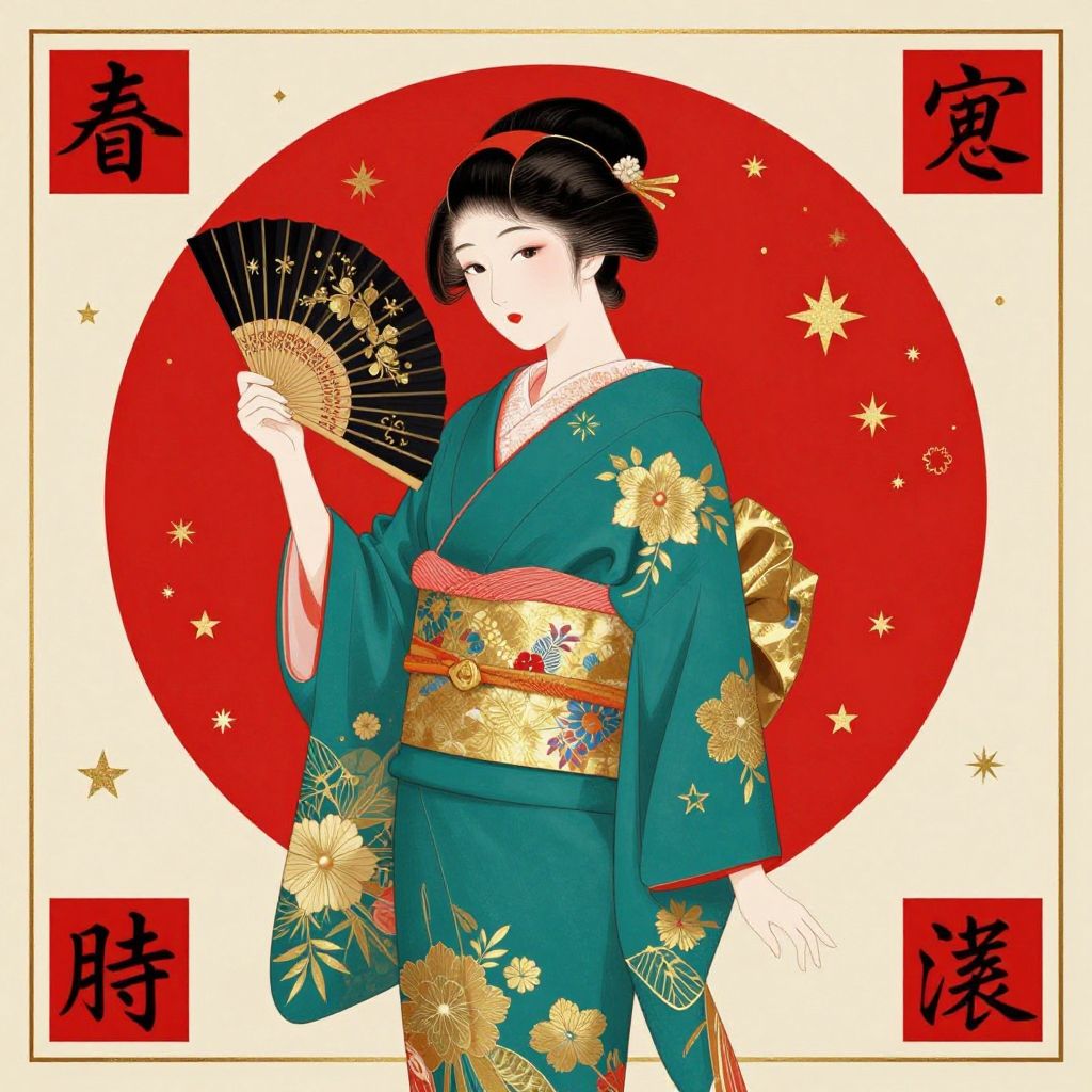 Traditional Japanese artistry unfolds in vibrant hues, featuring a woman in a teal kimono adorned with golden floral patterns, gracefully holding a black fan, set against a bold red circular backdrop with scattered gold stars, framed by elegant calligraphy in red squares.