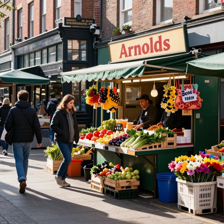 Arnolds in a bustling city street market, vibrant colors of fresh produce and flowers surrounding a charming food stall named Arnolds, early morning light casting lively shadows, dynamic composition with street vendors and shoppers in motion, hyperrealistic detail.