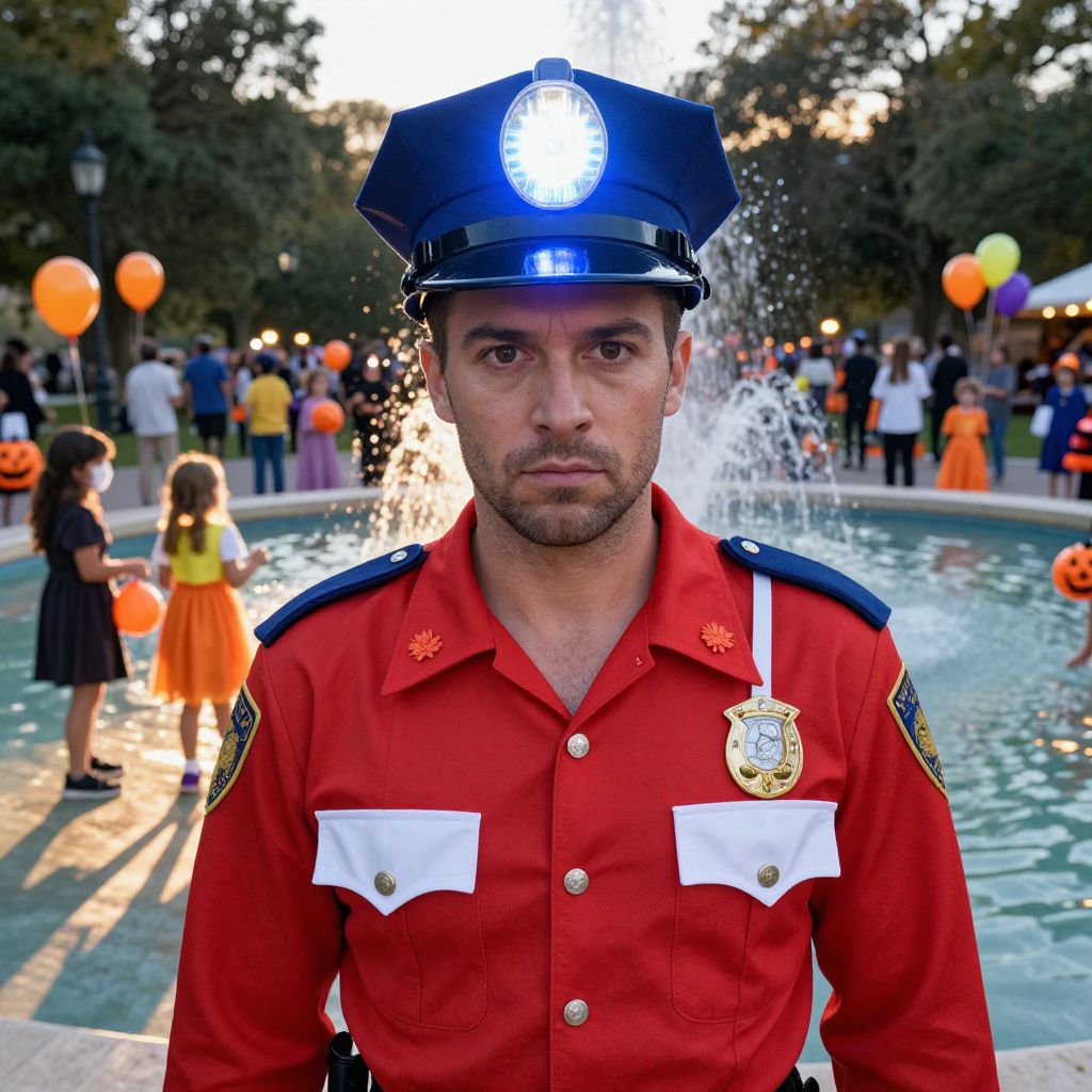 A candid photo of a man in a vibrant Halloween police costume, with a red uniform, a white uniform jacket, and a glowing police light on his helmet; he has a rugged face with a stubble, deep brown eyes, and short brown hair; set on a park fountain during a festive Halloween night, surrounded by children in costumes and glowing balloons, with a soft golden hour light casting long shadows.