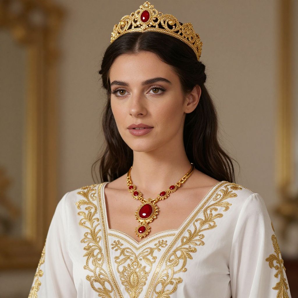 This is a photograph of a young woman with light olive skin and dark brown, wavy hair. She wears a gold and red jeweled tiara and a matching necklace with an oval red gemstone. Her white dress features intricate gold embroidery along the neckline and sleeves. She has dark, arched eyebrows, brown eyes, and is wearing subtle makeup with mauve lipstick. The background is blurred, featuring beige walls and golden-framed mirrors, suggesting an elegant, classical setting. The lighting is soft, highlighting her serene, composed expression.