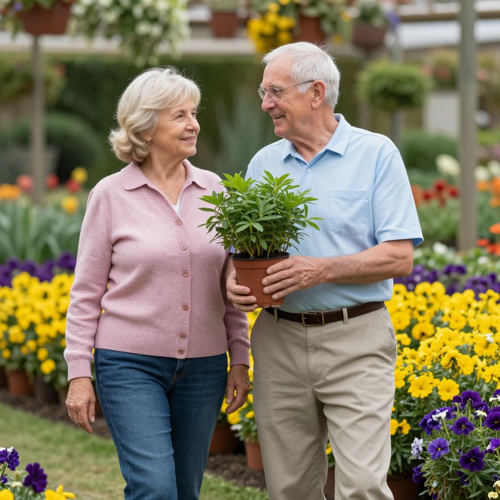 Senior couple strolling through a vibrant garden, the man holding a potted plant with lush green foliage while the woman walks beside him, both smiling and enjoying the colorful surroundings of blooming yellow and purple flowers.