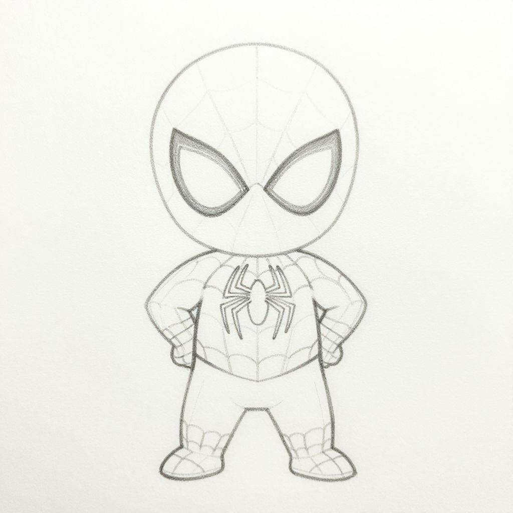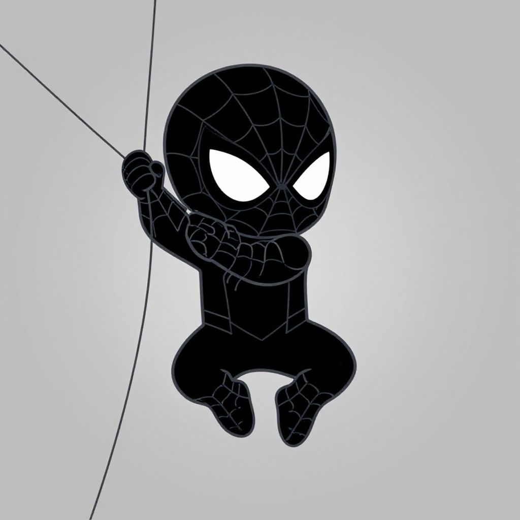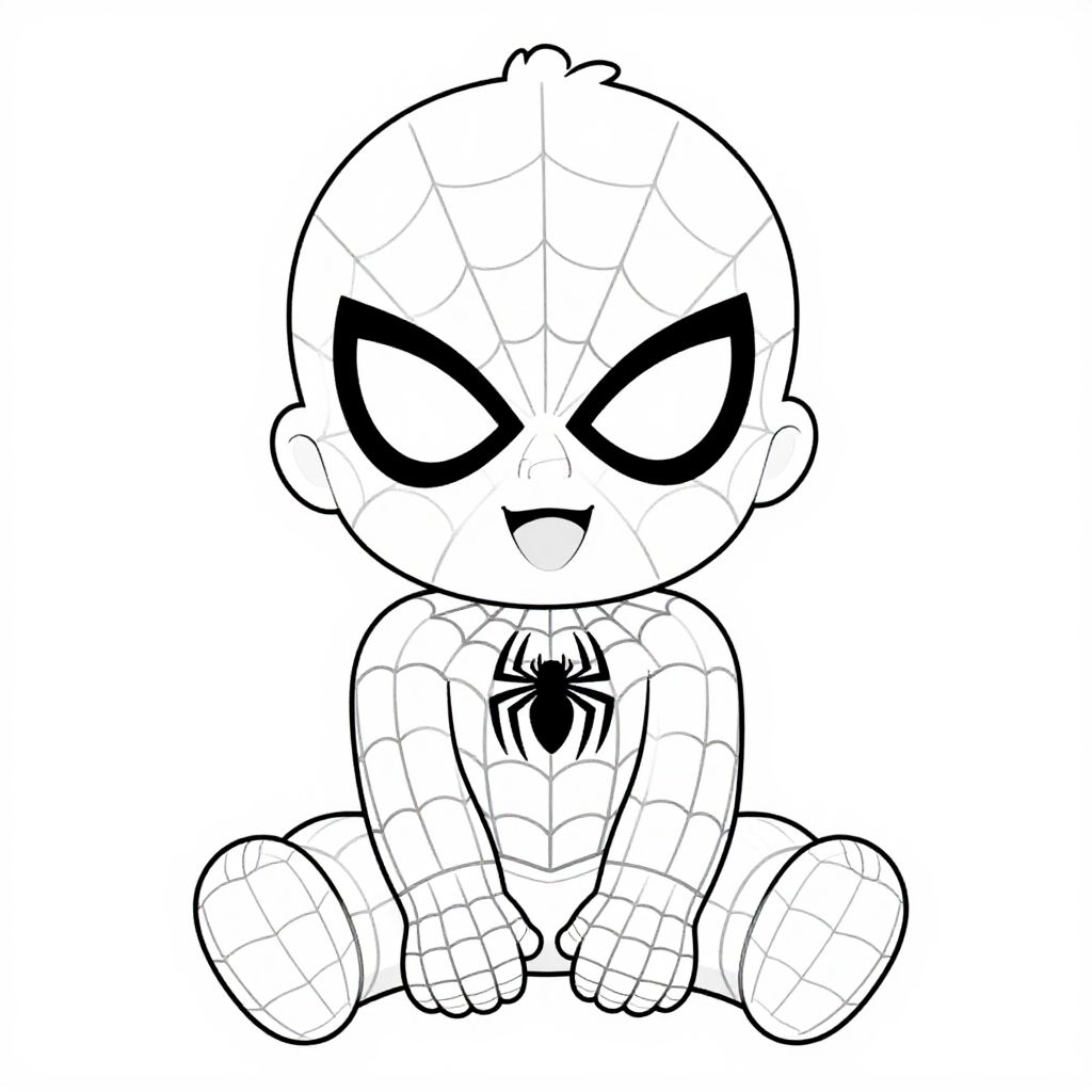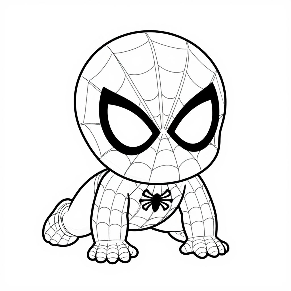 Baby Spiderman outline, a cute toddler sized superhero in a simple black and white sketch style, clear bold lines, playful pose, web details around hands, minimalistic background, cartoon style, 2D vector art