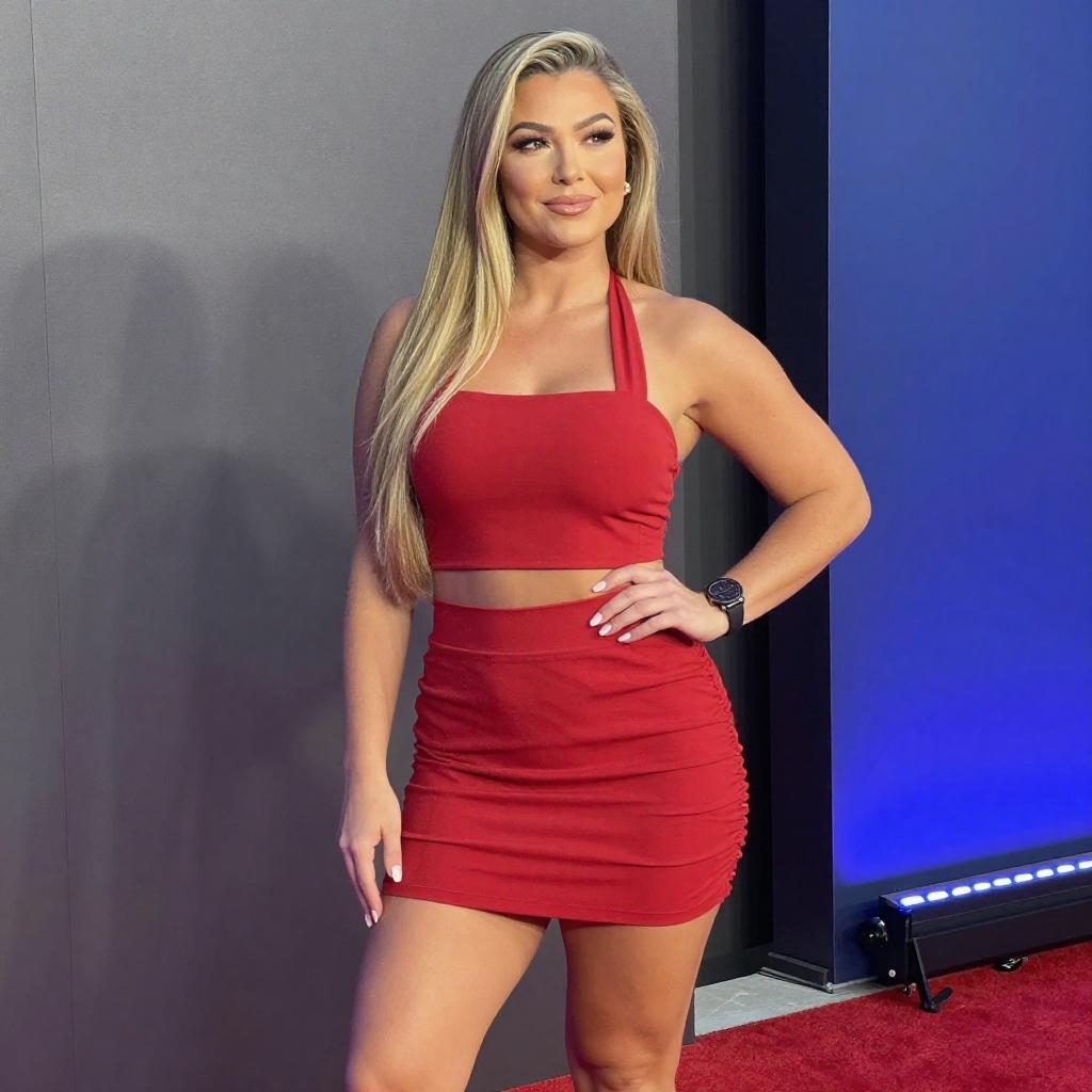 Photograph of a blonde woman with long, wavy hair and light skin, wearing a pink, ruched, sleeveless mini dress with a side tie, and pink pointed heels. She stands in front of a blue-lit background with green plants, smiling slightly, with her hands gently clasped in front of her.