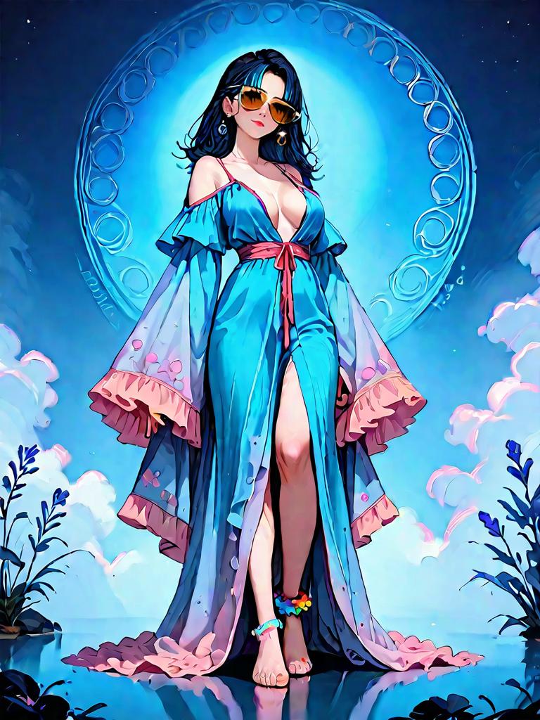 Digital artwork of a full-body dark fantasy woman standing barefoot by water at night, wearing a vibrant turquoise boho sundress with a plunging neckline, off-the-shoulder sleeves, tiered ruffle hem, and delicate embroidery. She has oversized sunglasses, beaded anklets, and espadrille wedges, set against a misty, moonlit background with surreal circular patterns and clouds.