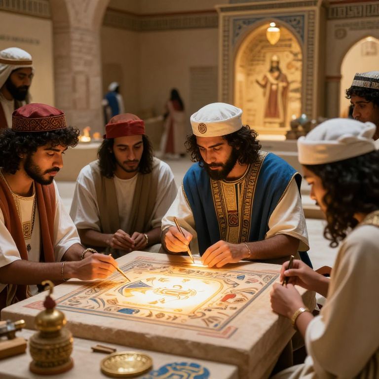 Photograph of six Middle Eastern men with dark curly hair and beards, wearing traditional white and blue robes with gold embroidery, and white or red caps, gathered around a glowing, intricately patterned stone slab in a dimly lit, ornately decorated room. They are intensely focused on the slab, which has a central, illuminated design. The background features arched niches with illuminated statues, and soft, warm lighting. One man in a blue robe is centrally positioned, appearing to lead the group, while others surround him, each reaching towards the slab. The room's ambiance is historical and sacred.