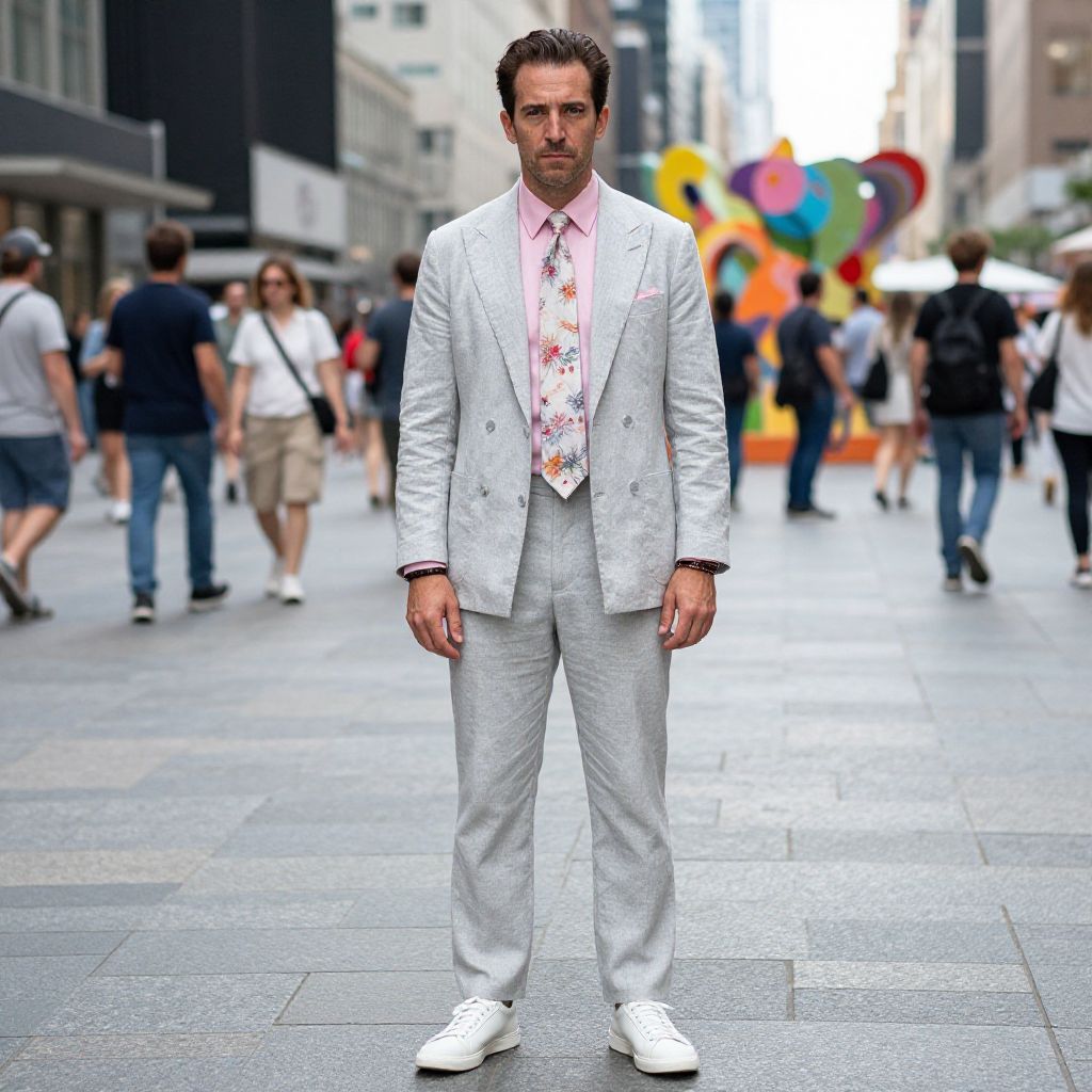 Photograph of a handsome man with short brown hair, wearing a light gray suit, pink floral tie, and white shoes, standing confidently in a busy