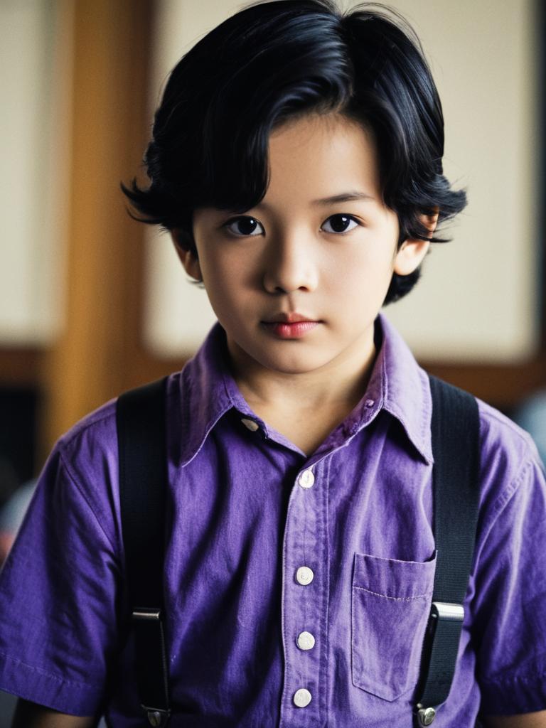 Purple shirt costume, male focus, 1boy, solo, shirt, suspenders, black hair, aged down, realistic, looking at viewer, blurry, child, blurry background