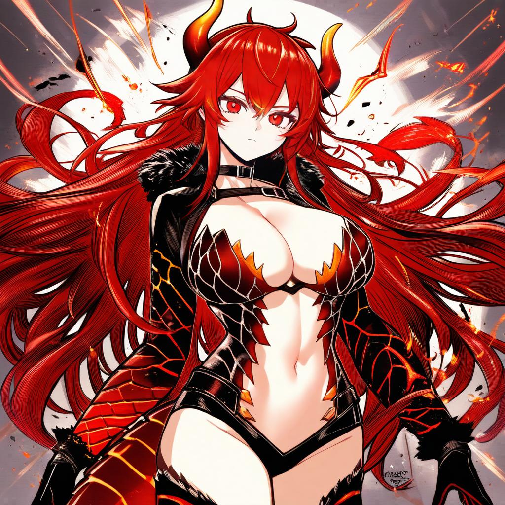 Digital artwork of a dragon-themed anime girl with long flowing red hair, red eyes, and dragon horns. She wears a striking black and red outfit with scale-like patterns, fur accents, and revealing design highlighting her cleavage and navel. The background features fiery and explosive effects enhancing the powerful and mystical atmosphere. Inspired by virtual YouTuber characters and created in an anime style by artist Kotoba Noriaki.