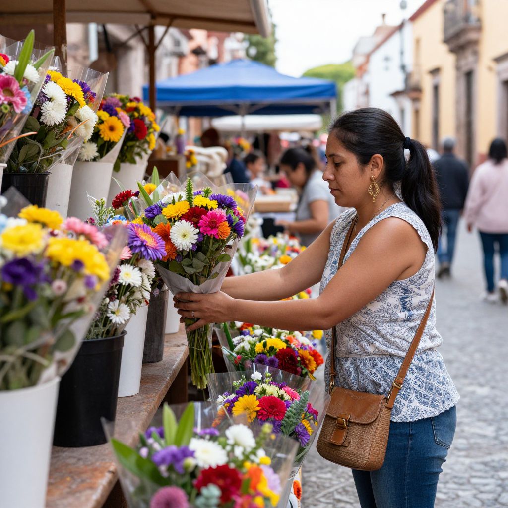 Woman carefully arranging vibrant bouquets of colorful flowers along a long display table in the bustling market of San Miguel de Allende, Mexico, a UNESCO World Heritage Site.