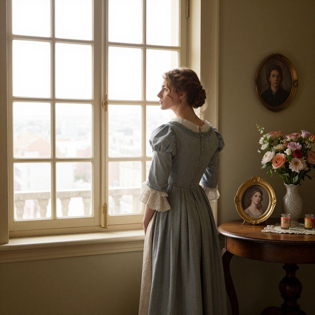 Woman in period attire stands contemplatively by a large, multi-paneled window, her gaze directed outward toward a distant cityscape, while a wooden table adorned with floral arrangements and framed portrait rests to her right in a warmly lit room.