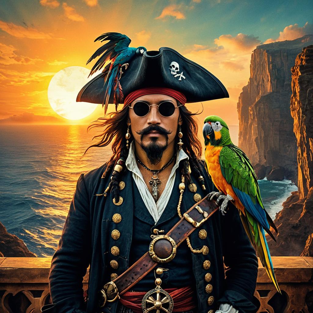 A beautiful dramatic epic ethereal symmetrical painting of a pirate with a parrot perched on his shoulder | he is sun-weathered with an eye patch and a feathered hat | the background is blazing sunset cliffs | tarot card, art deco, art nouveau | by Ivan Aivazovsky | trending on artstation