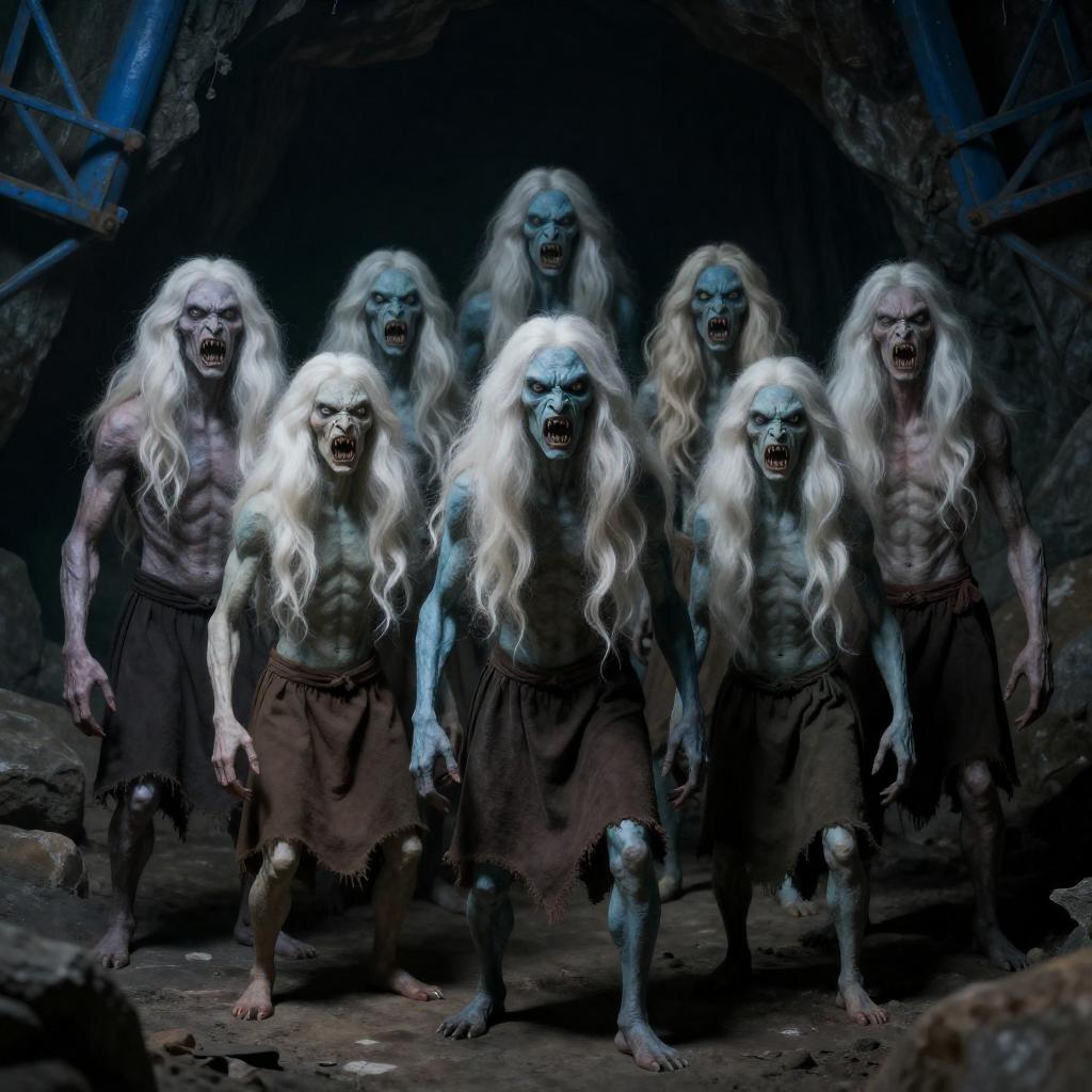 Seven grotesque, humanoid creatures with long white hair, blue-green skin, and exposed torsos. They wear brown skirts and stand menacingly in a dark cave with rocky walls and blue metal structures. Creatures have aggressive facial expressions, with bared teeth and wide eyes. Dim lighting casts shadows, enhancing their menacing appearance.