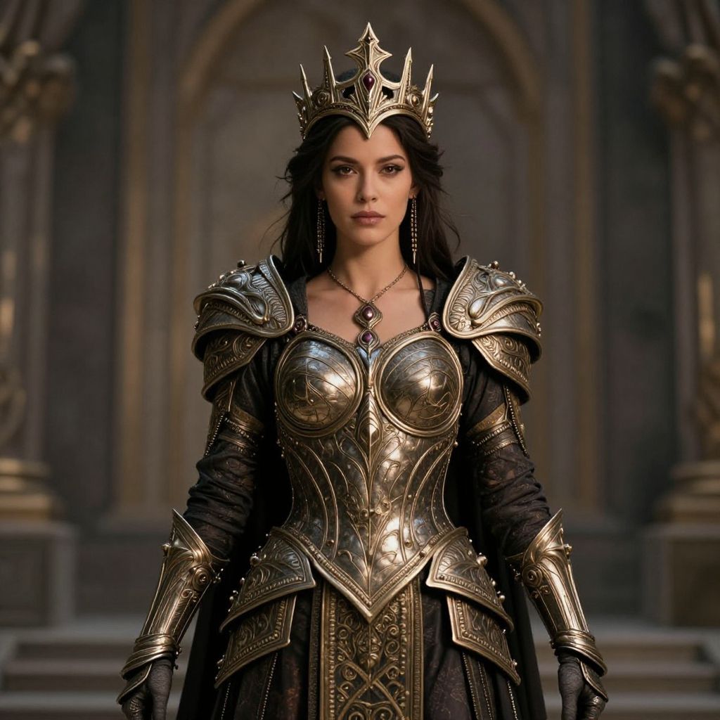 This striking image features a woman in an intricately designed Chthon costume, embodying a powerful and regal character. The ornate armor and majestic crown add to the fantasy style, evoking themes of bravery and mysticism reminiscent of epic tales.