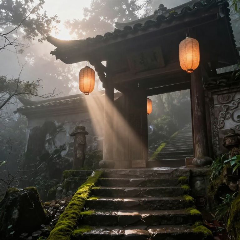 Torri amidst a mountainous landscape shrouded in early morning fog, rays of sunlight piercing through the mist, ancient paper lanterns hanging delicately, moss-covered steps leading up to the gate, rich earth tones and spiritual ambiance evoking traditional culture.