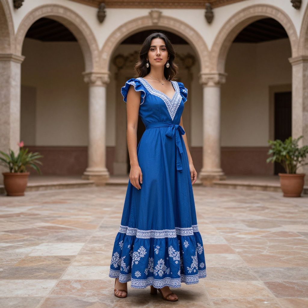 Spanish Frocks, woman in a blue dress standing in a courtyard