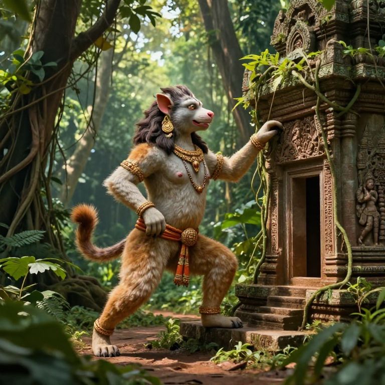 Hanumans illustrated in a lush jungle environment, interacting with temple ruins overgrown with vines and ancient carvings, sunlight filtering through dense canopy, naturalistic fur textures, dynamic movement, warm earth tones with subtle highlights.