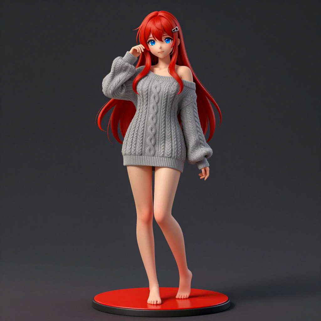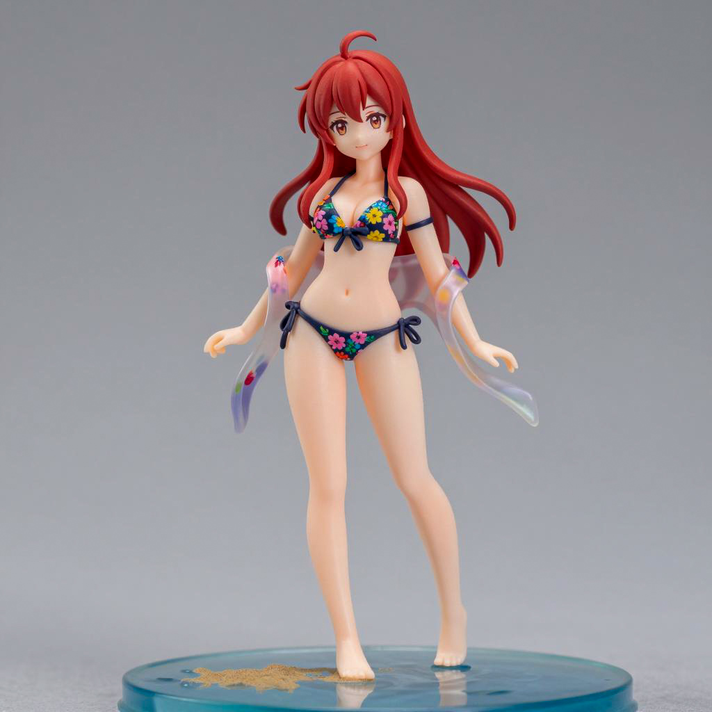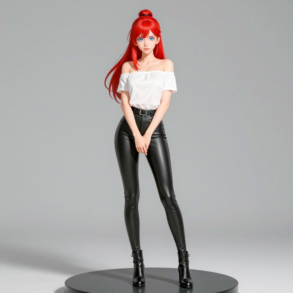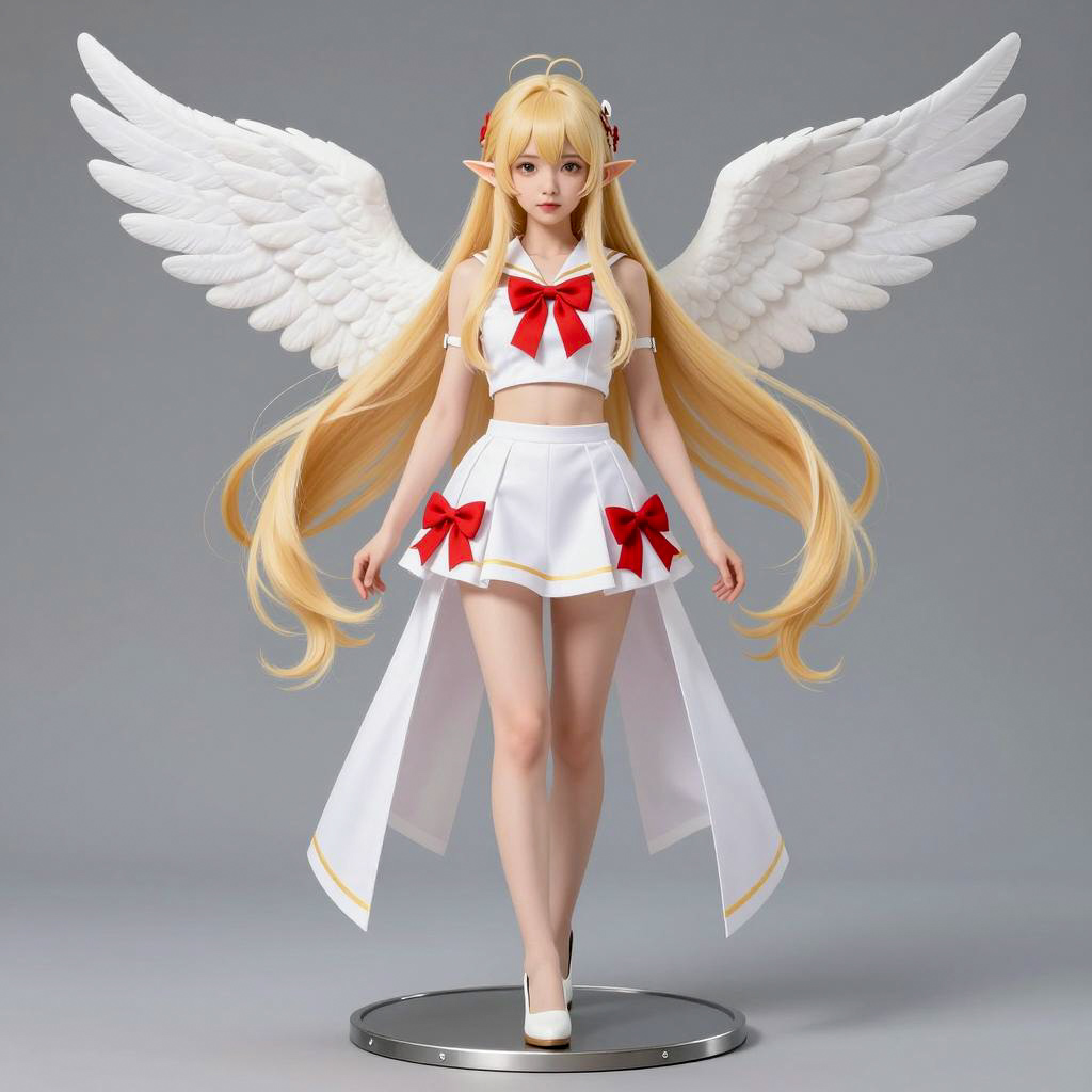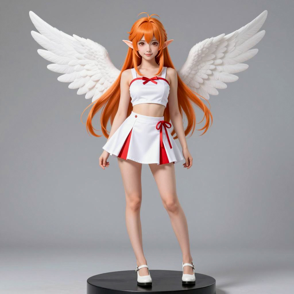 Anime-style figure of a sexy fairy girl with long orange hair, elf ears, and large white wings. She wears a white crop top with red ribbons, a short white skirt with red ribbons, and white Mary Jane shoes. She has a slim build, large breasts, and a confident stance. Her brown eyes look forward with a slight smile. The background is a plain gray gradient. She stands on a round black pedestal.