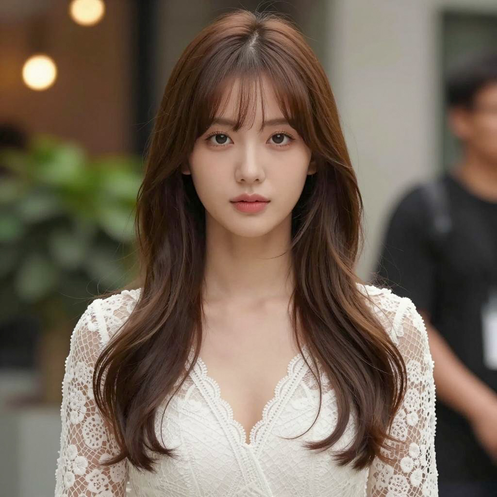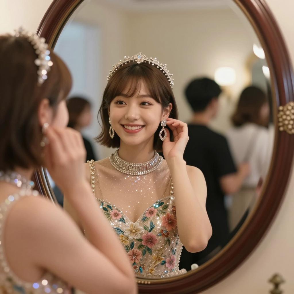 Girl with short brown hair, wearing a sparkly headpiece and large earrings, smiling at her reflection in an oval mirror. She has a glittery floral patterned dress with a glittery high collar. Her right hand touches her ear. Background is blurred with indistinct figures. Mirror has a dark frame with metallic studs.