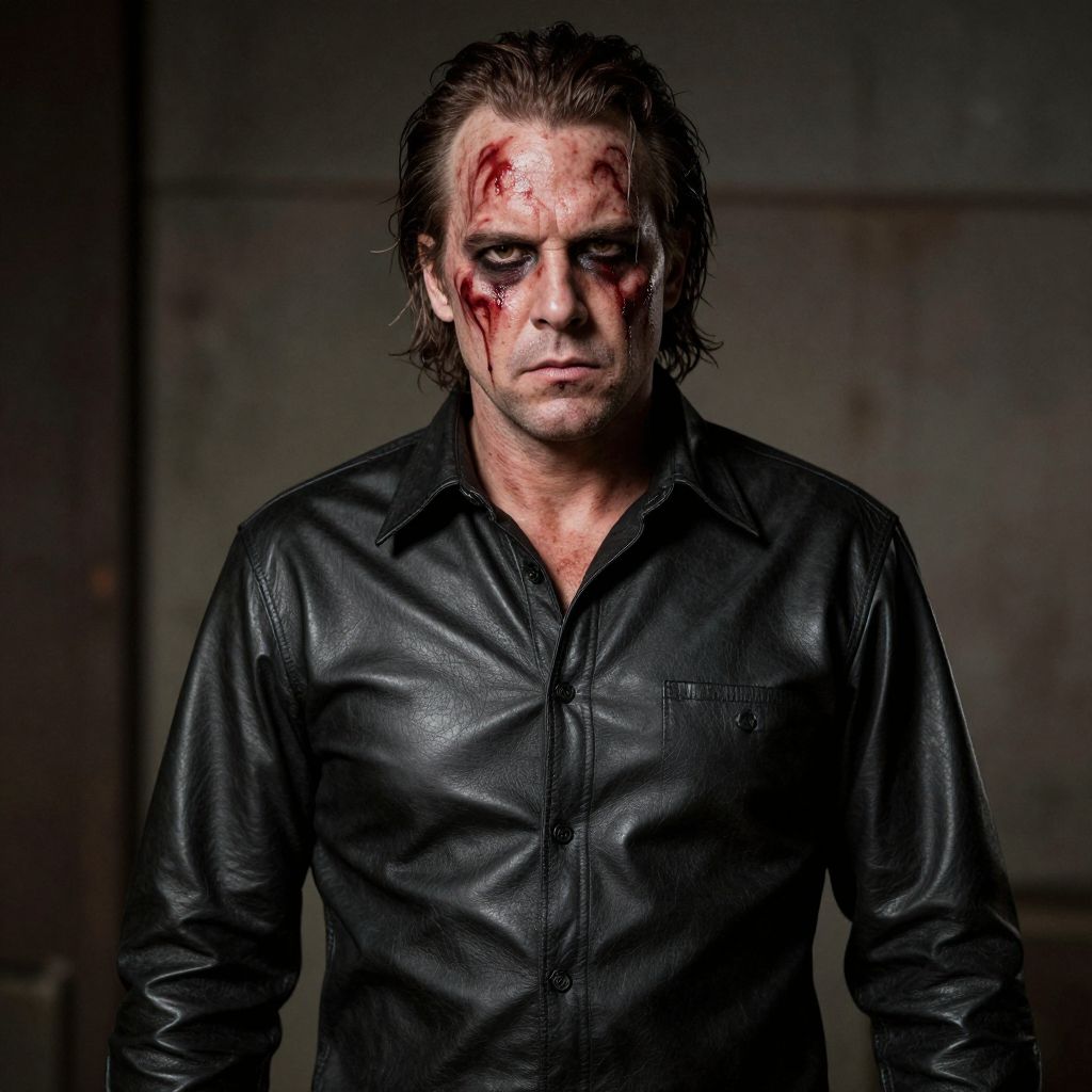 Photograph of a grim-faced man with blood on his face, wearing a black leather button-up shirt, standing against a dark, industrial background.