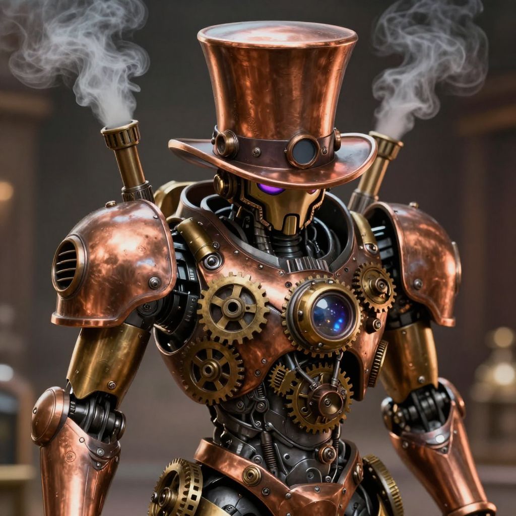 Steampunk robot with copper top hat, brass armor, gears, and smoking pipes, emitting white smoke in a dark industrial background.