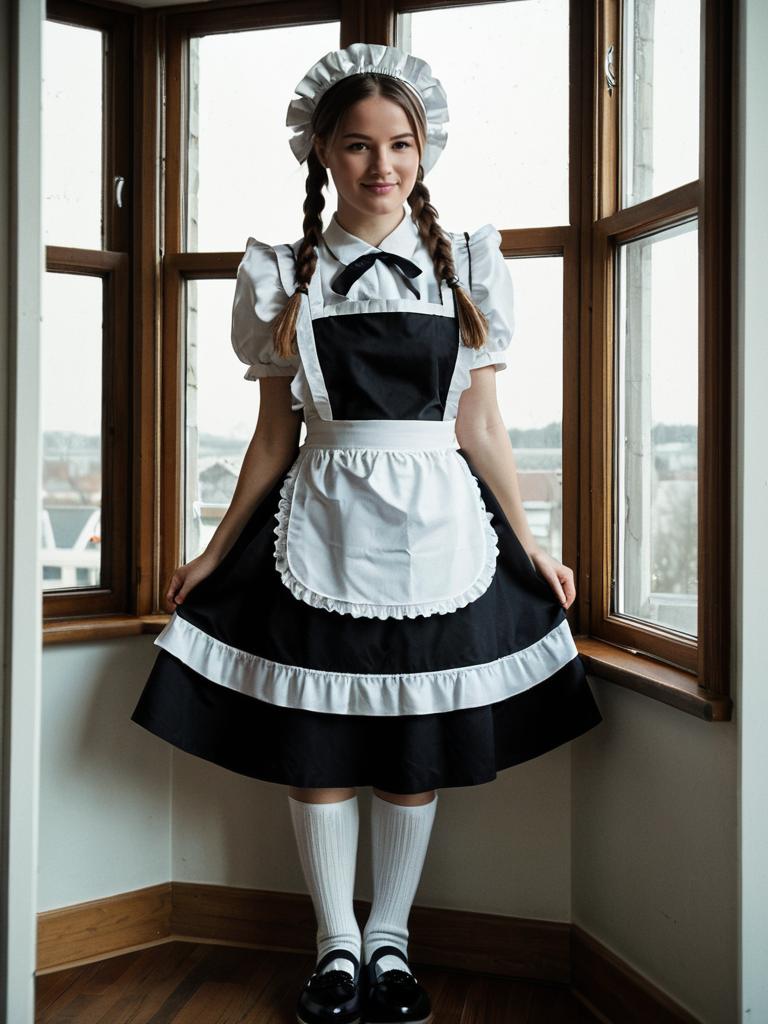 Mischievous maid costume, 1girl, solo, maid, twin braids, maid headdress, braid, socks, realistic, apron, brown hair, full body, white socks, maid apron, looking at viewer, window, long hair, shoes, dress