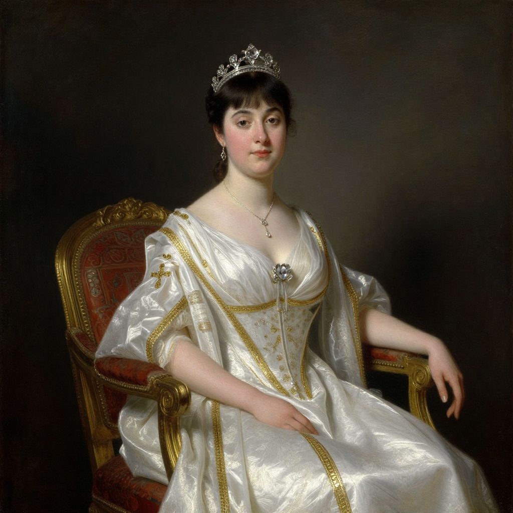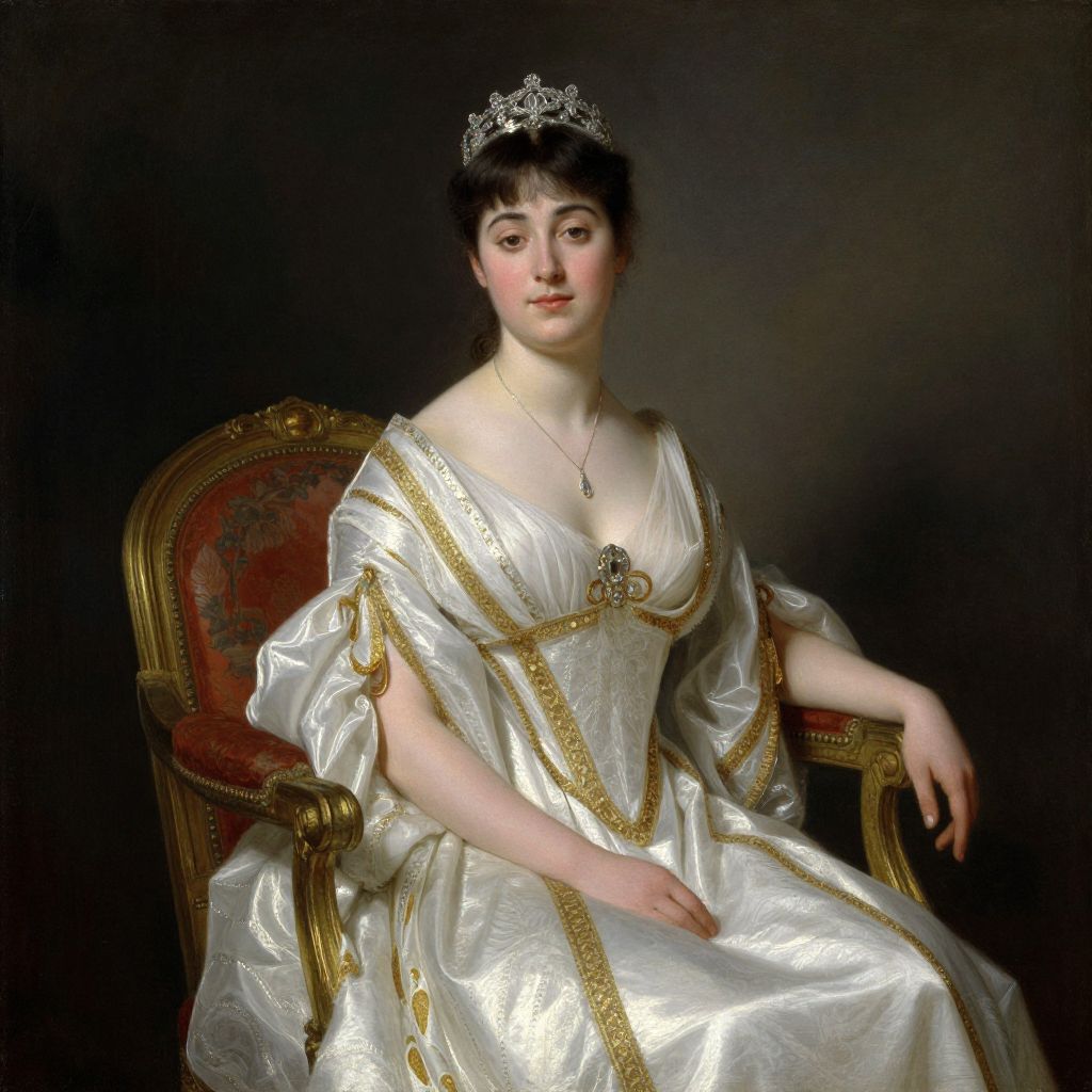 A regal portrait rendered in the classical style of William Powell Frith, featuring a woman adorned in an elegant white gown with gold embellishments, a tiara, and a delicate necklace, seated on a richly upholstered chair against a dark backdrop, exuding a timeless elegance characteristic of 19th-century oil paintings.