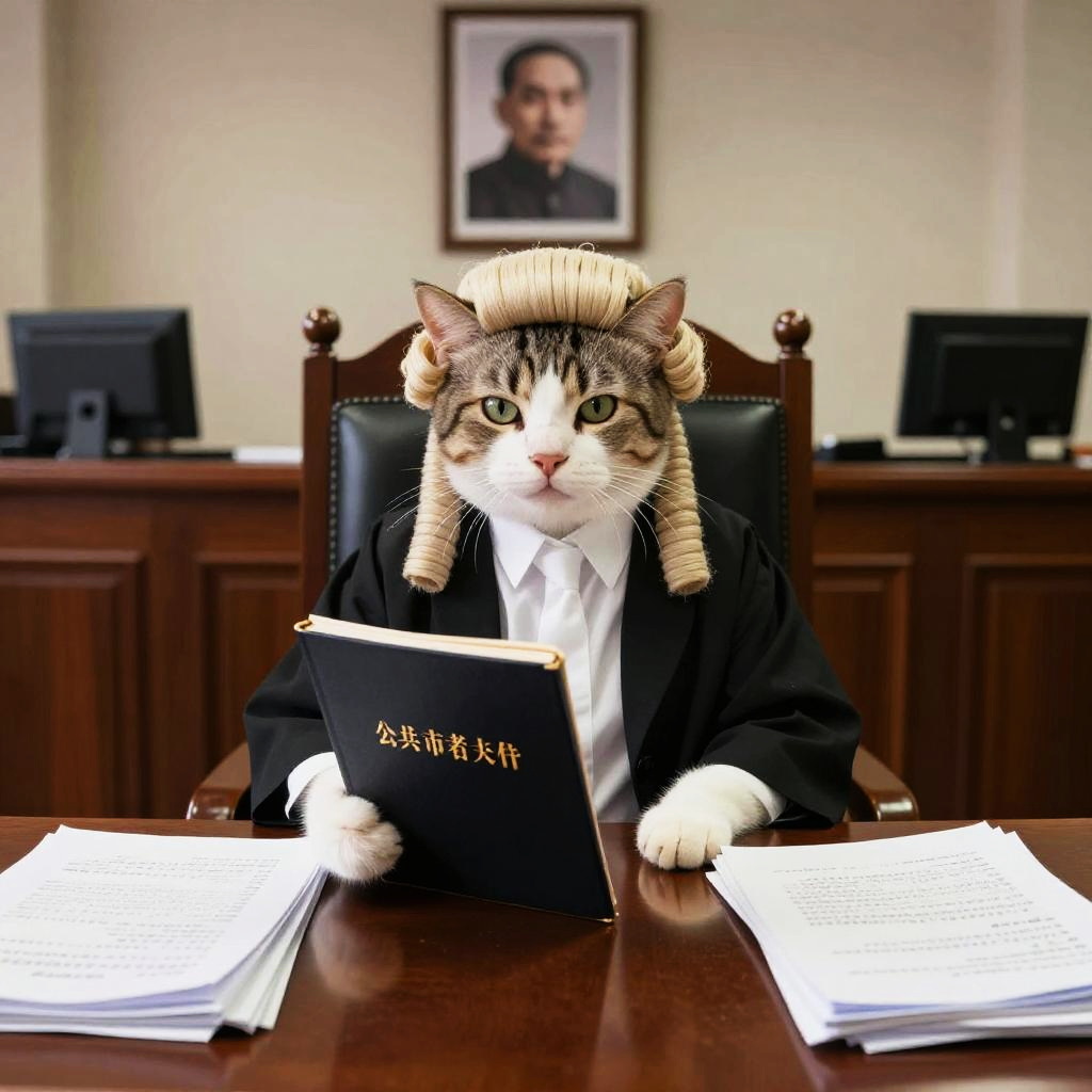 Realistic photo.A cat wearing a barrister's wig and presiding over a legal case in a Taiwanese courtroom. The cat holds a legal brief and sits beside a pile of Taiwanese legal documents with traditional Chinese characters. The background includes a portrait of Sun Yat-sen and polished wooden courtroom benches. The atmosphere is serious and distinctly Taiwanese. realistic photo